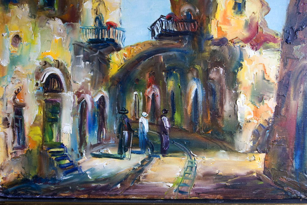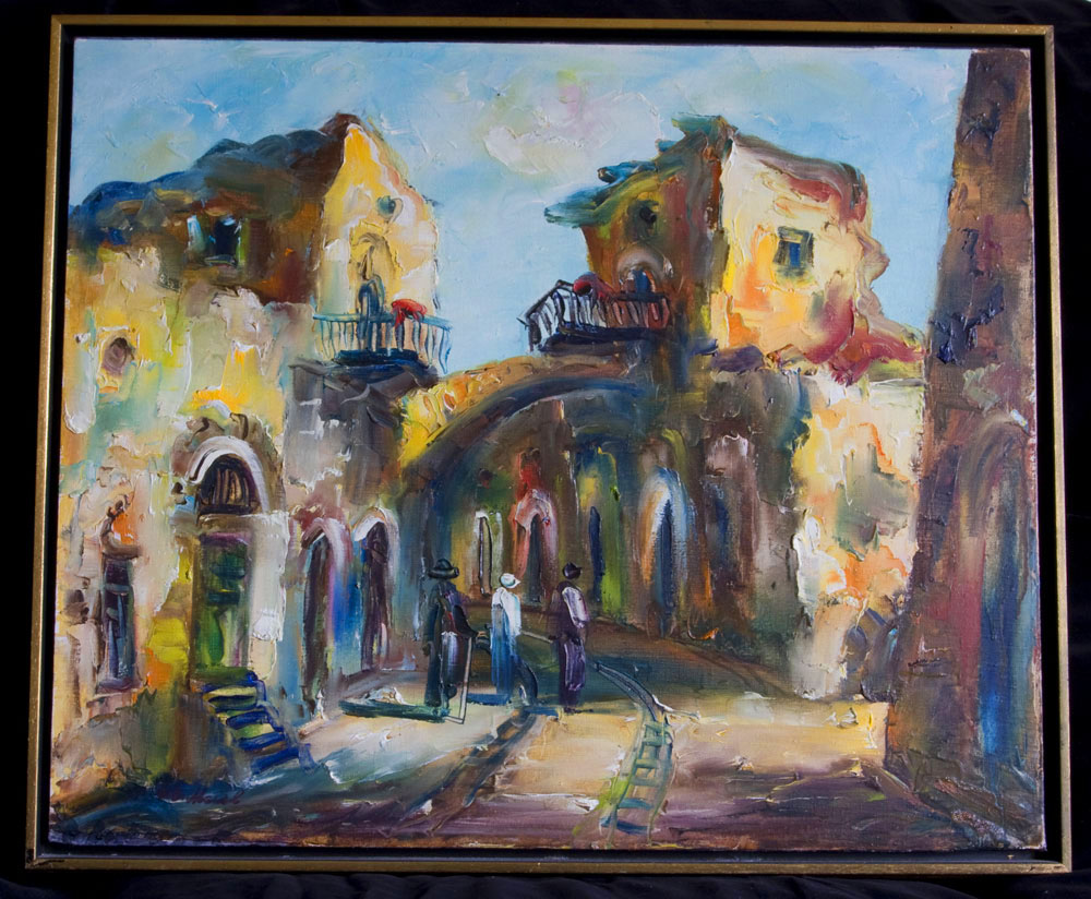 Tucked into the back of the canvas was the photostat review of an exhibition by Edith Meisl-Bernhard at the Katz Gallery in Tel Aviv in 1965, from which this painting presumably comes. It is the only thing that I can find out about the artist but what a life it seems: art training in Budapest and at the Rome Academy of Art; set design at the National Theatre and State Opera houses in Arad and Timisoara, Rumania; set design and costumes at the Israel Opera, Tel Aviv; and exhibiting artist. I have always treasured this painting – for the light, the colours and the atmosphere the artist creates within the picture frame. If anyone knows more about the artist could you please contact me. Thank you.