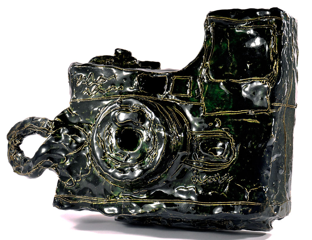 His three-dimensional works, most notably the cameras, also sit well within this theme and given the fact that Constable is legally blind is also obliquely referenced. Constable’s ceramic works reflect a life-long fascination with old cameras, which began with his making replicas from cardboard cereal boxes at the age of eight. The sculptures are lyrical interpretations of technical instruments, and the artist’s finger marks can be seen clearly on the clay surface like traces of humanity. In this way, Constable’s cameras can be viewed as extensions of the body, as much as sculptural representations of an object.