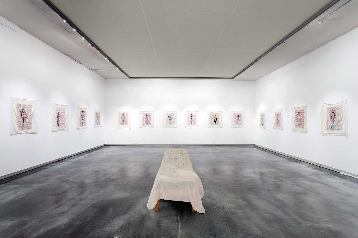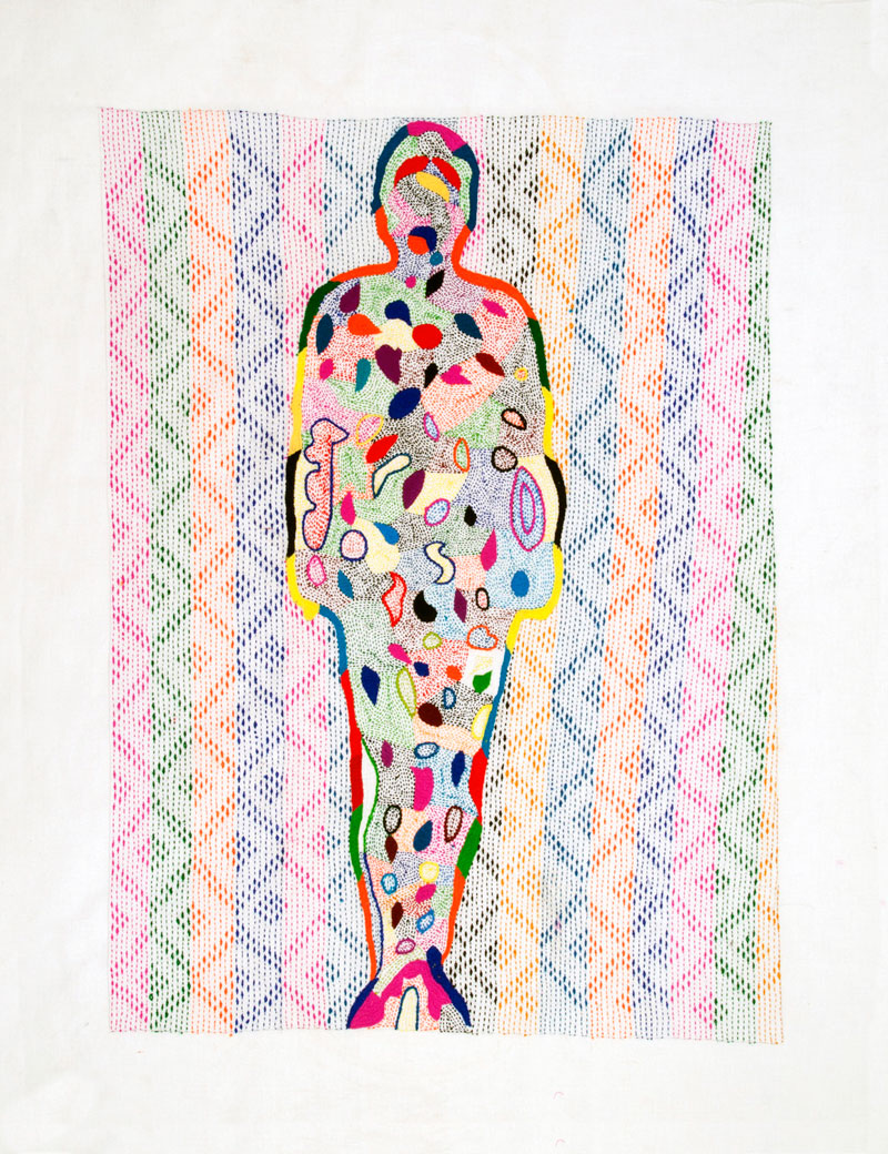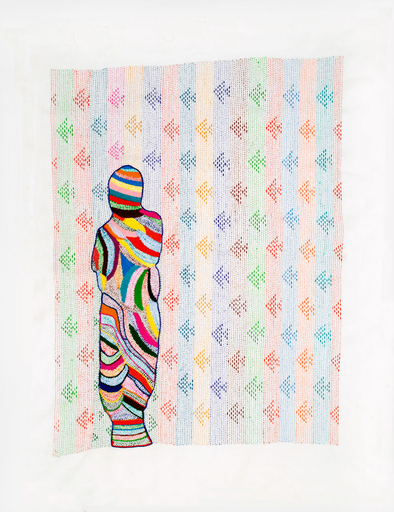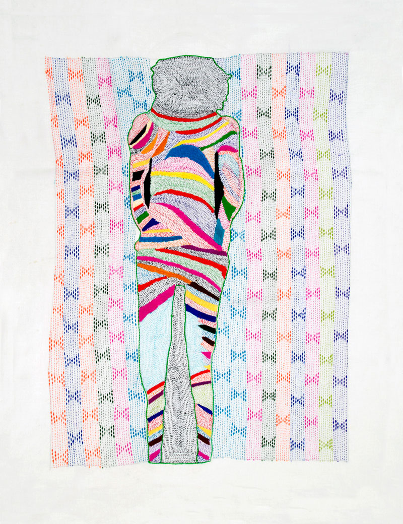 Tourist #5: disappearing project 1-40 is a multi-faceted project that teases out notions of seeing and being seen and the role of creator as truth teller. Loder sent out a flyer inviting people who had disappeared to send her a full-length image of themselves with a written description of what happened when they disappeared. The stories and images she received range from out of body near death experiences to the mundane act of sleeping, each shedding light on what people identify as disappearing. Loder then manipulated the submitted images into highly colourful digital patterns, resonant of her earlier photographic work. She took the reworked images to India where they were embroidered onto muslin by local women in West Bengal. The result is beautiful hand-embroidered works that reflect the women’s personal interpretations of the images and incorporate their rich history, cultural patterns and iconography.