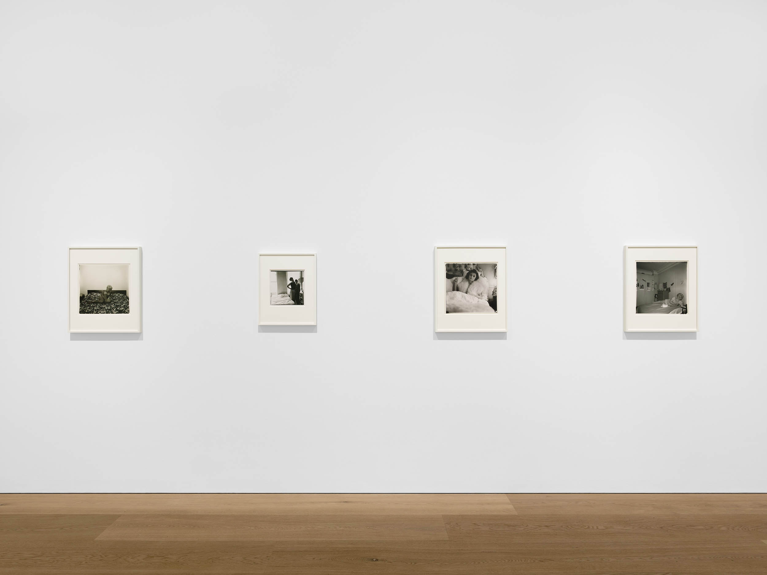 Installation view of the exhibition Diane Arbus: Sanctum Sanctorum at David Zwirner, London showing at left, Arbus’ Girl sitting on her bed with her shirt off, N.Y.C., 1968; at centre, Interior decorator at the nudist camp in his trailer, New Jersey 1963; at second right, Mrs. T. Charlton Henry in a negligee, Philadelphia, Pa. 1965; and at right, Triplets in their Bedroom, N.J., 1963
