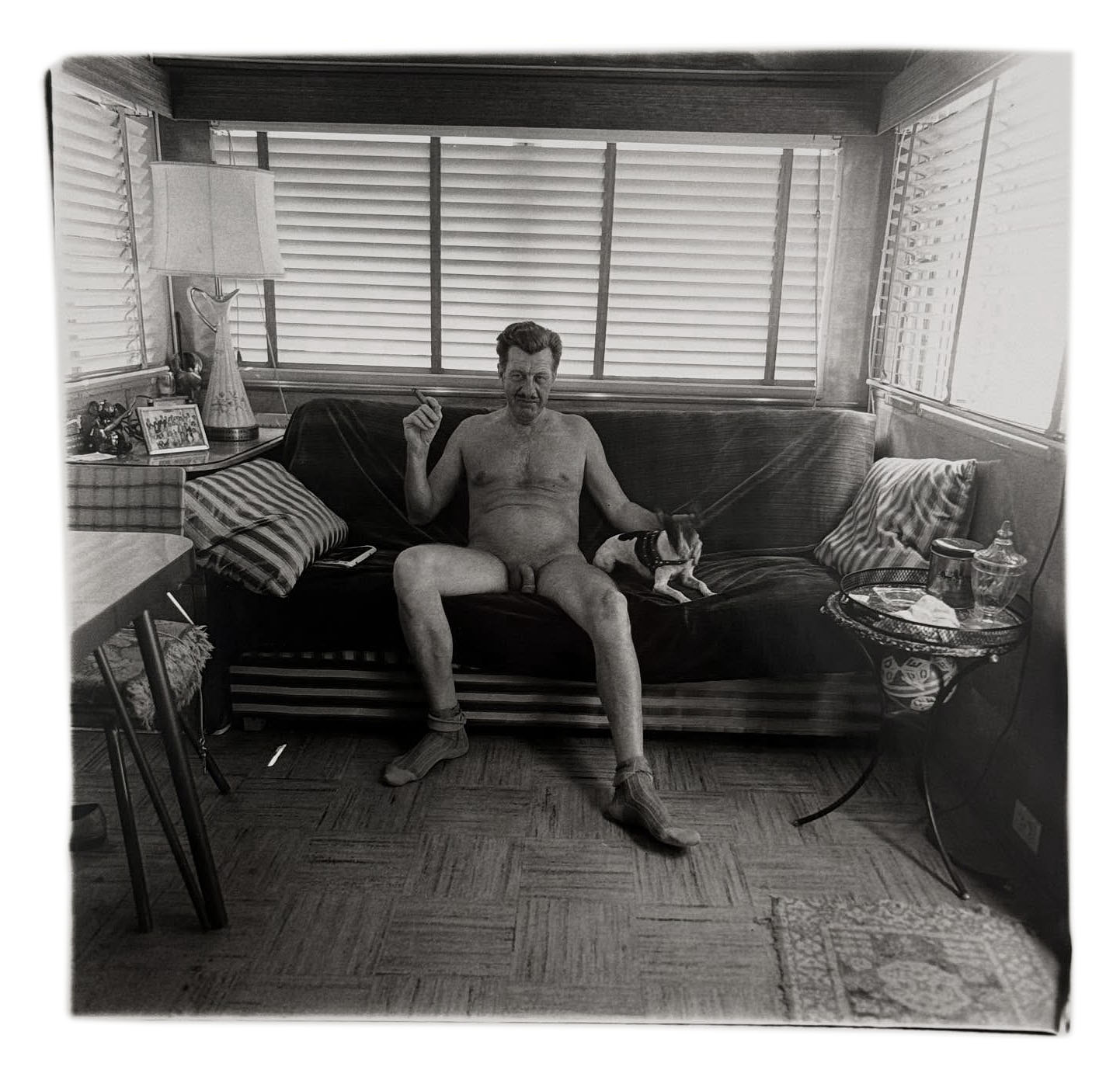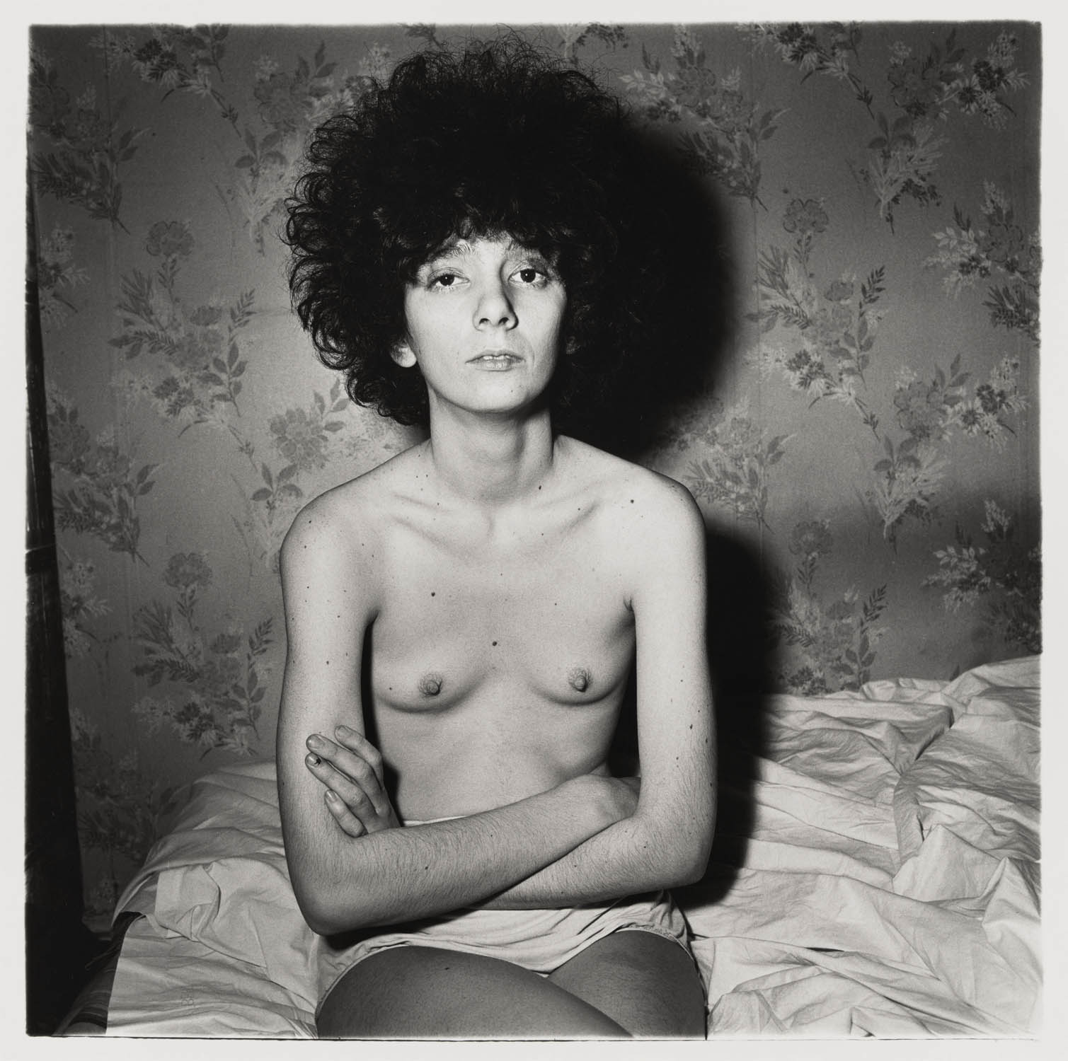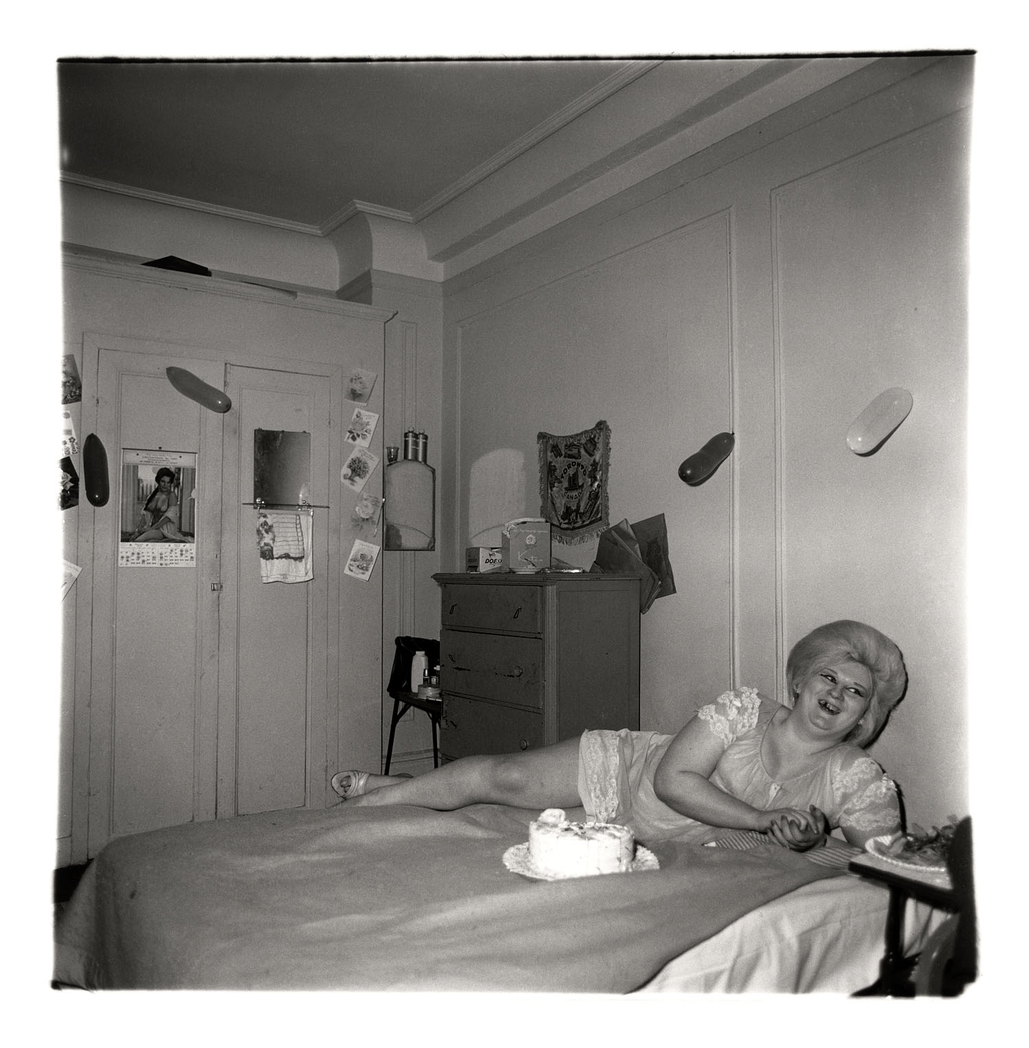 The exhibition brings together little-known works, such as Girl sitting in bed with her boyfriend, N.Y.C. 1966; Ozzie and Harriet Nelson on their bed, Los Angeles 1970; and Interior decorator at the nudist camp in his trailer, New Jersey 1963, alongside celebrated images like Mexican dwarf in his hotel room, N.Y.C. 1970 and A naked man being a woman, N.Y.C. 1968.
