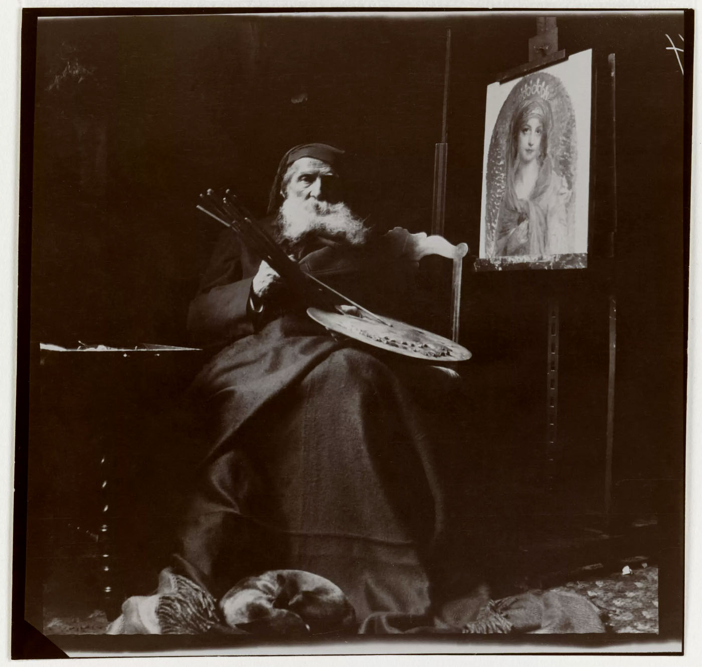 The painting in the photograph is probably La Vierge de Chausseur by Ernest Hébert (c. 1891, below)
