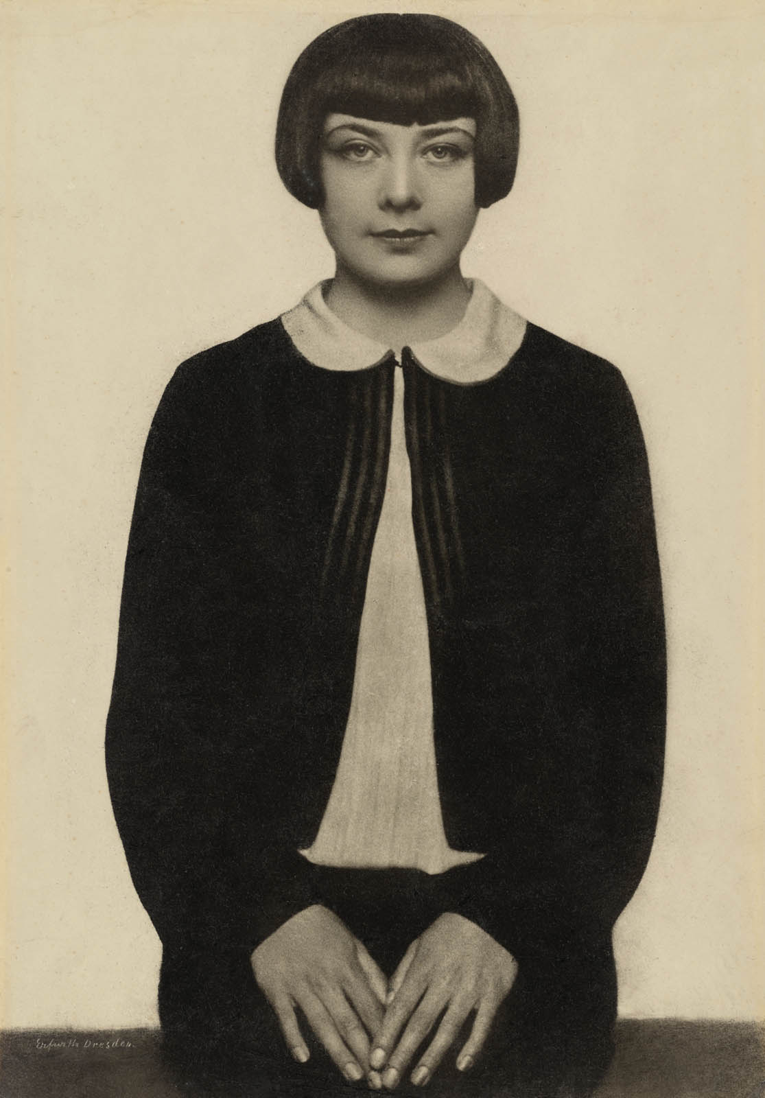 When Hildegard Seemann-Wechler had her portrait taken in Hugo Erfurth’s studio in Dresden, she was studying painting with Otto Dix. The strict frontality of this picture, the neutral background, and the direct gaze into the camera are softened by the slight hint of a smile at the corners of the artist’s mouth. Hildegard Seemann-Wechler’s bob hairstyle identifies her as a New Woman who rejects conservative role models. Her portrait breaks with the tradition of serious facial expressions in the 19th century and marks the threshold between not smiling and smiling. Collection presentations like this help us to explore our own works. On the back of this picture, the name “Hilde Wächler” is written in pencil. It was only during the preparations for Smile! that we noticed the mistake and were able to assign the person portrayed to her real name. In 1940, Hilde Seemann-Wechler was murdered by the Nazis.
