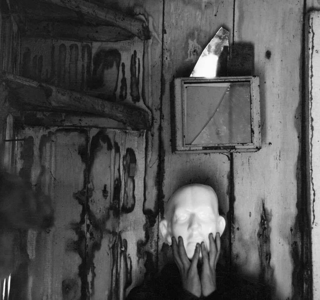 Meatyard suffered a heart attack in 1961. After this brush with mortality, he gave himself ten years to master photography. A sense of anxiety runs through many of his photographs. This image of a vacant masked face with hands pressed against its cheeks and a shard of broken mirror floating above embodies the persistent sense of pressure and tenuousness motivated by the finiteness of time.
