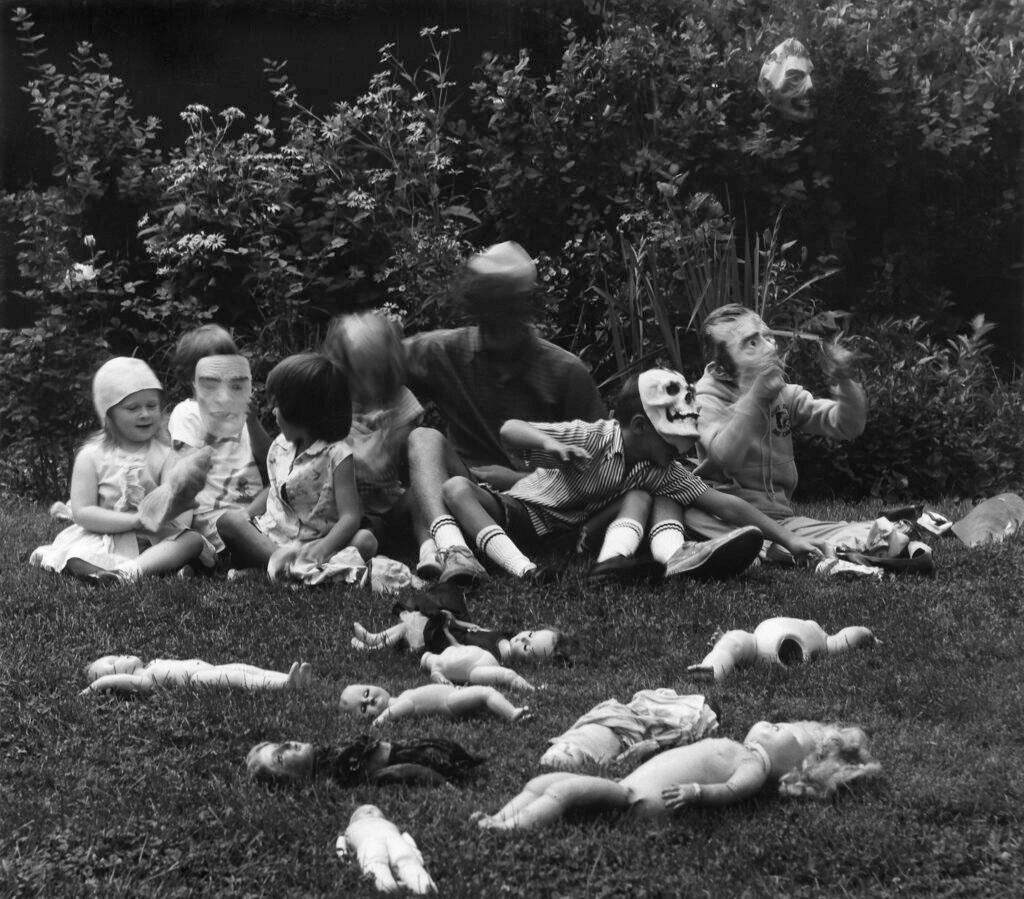 The 36 photographs include a number of signature portraits from Meatyard’s series Romance, and portray his family members, sometimes masked, inhabiting abandoned southern landscapes. Meatyard challenges the idea of traditional family portraits. In some images, children play in deserted rooms, maintaining their innocence in disconcerting environments. They are not afraid or amused – they simply exist within the infinite possibilities of this fictional world. In one image, an unrecognisable figure jumps out of a window into a yard where a little boy awaits. The movement of the jumping figure makes it resemble a spirit appearing to the boy in a dream. In creating this series, Meatyard was inspired by Ambrose Bierce’s definition of “romance” in “The Devil’s Dictionary” – defined as “fiction that owes no allegiance to the God of Things as They are.”