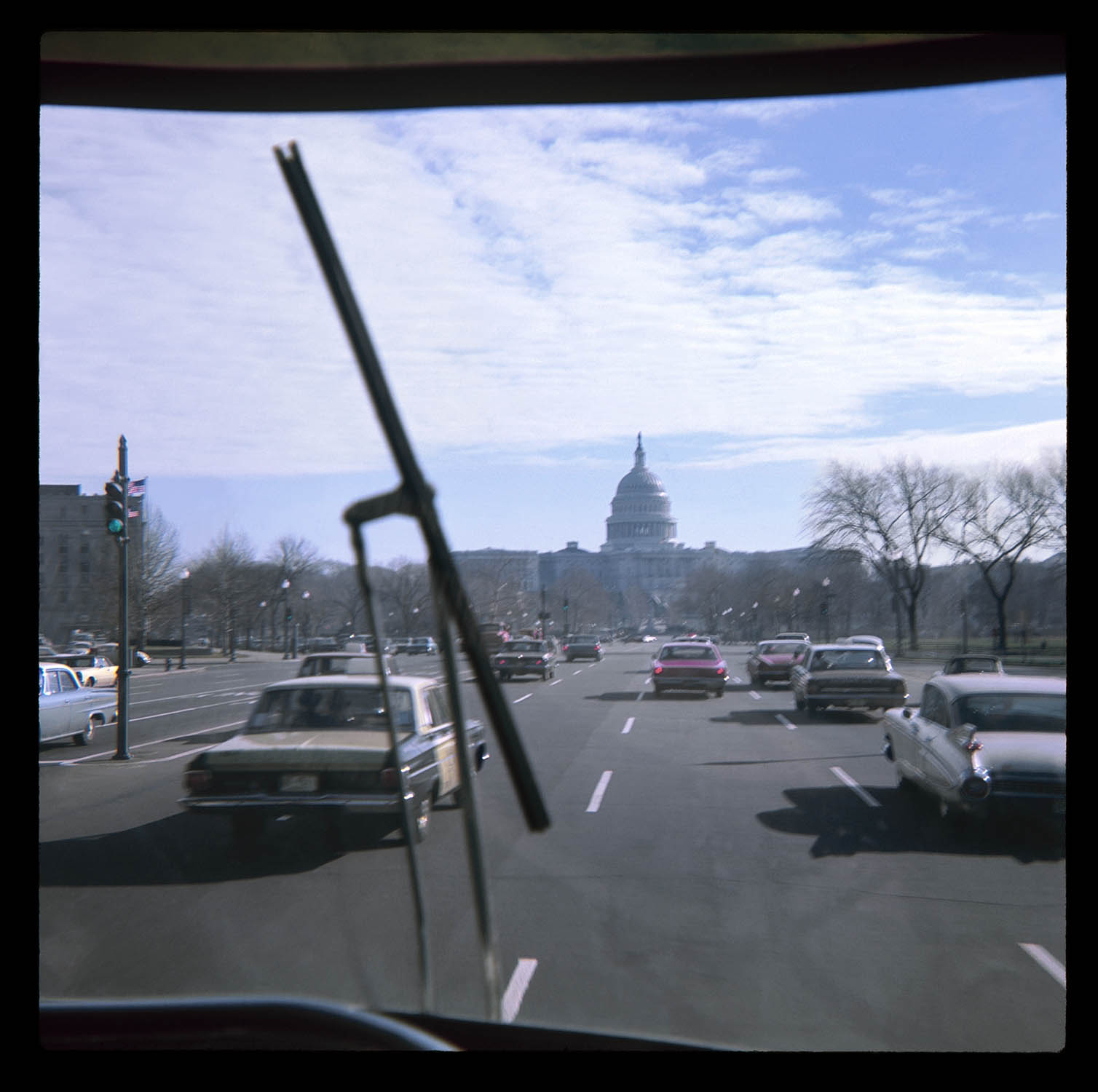 What a great image, shot out of the front of a bus driving towards the United States Capitol, love all the old cars!
