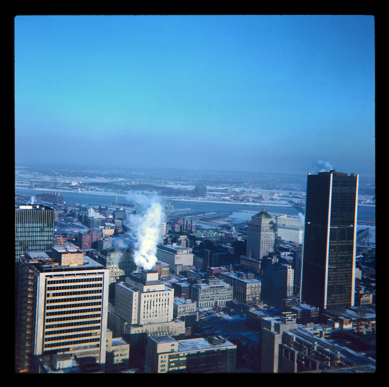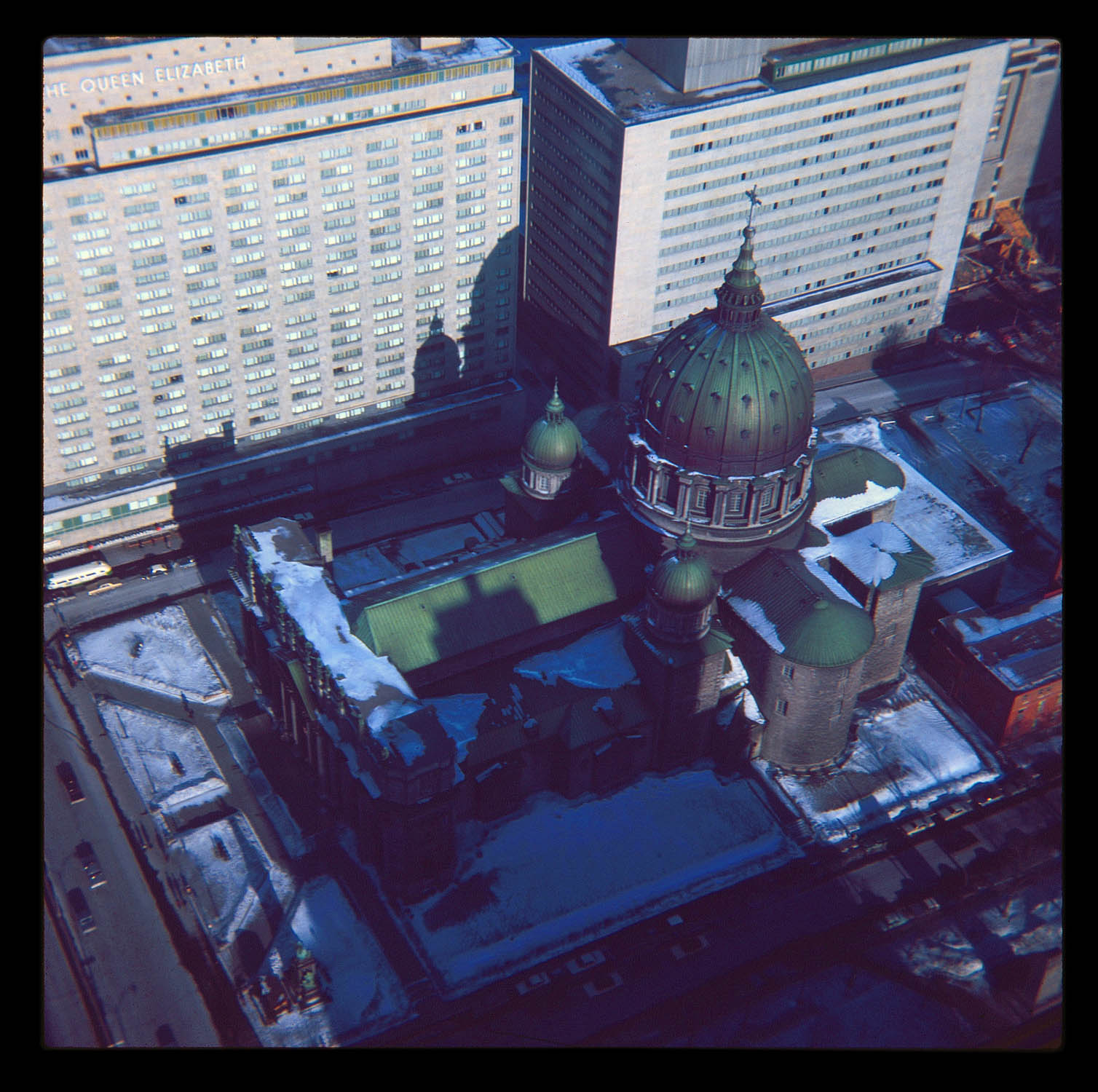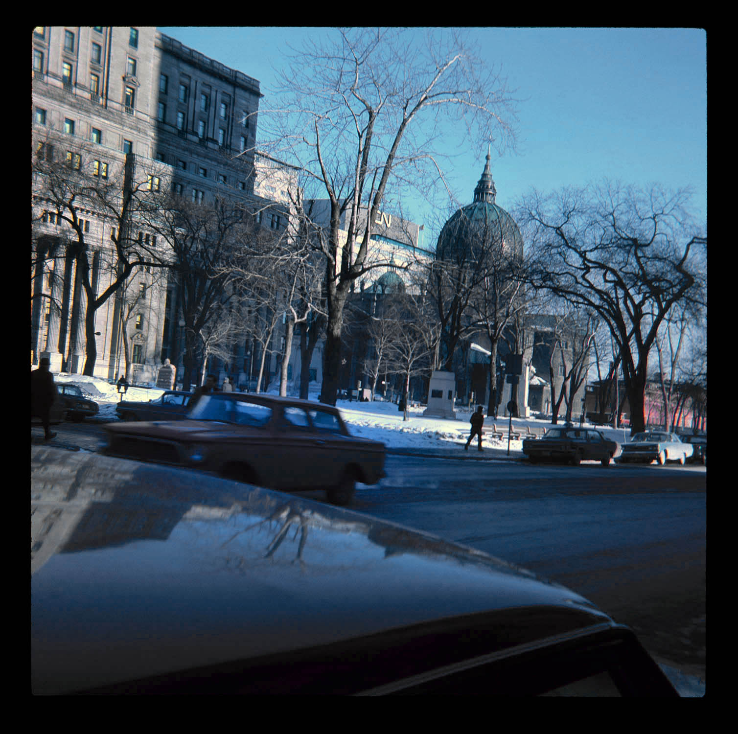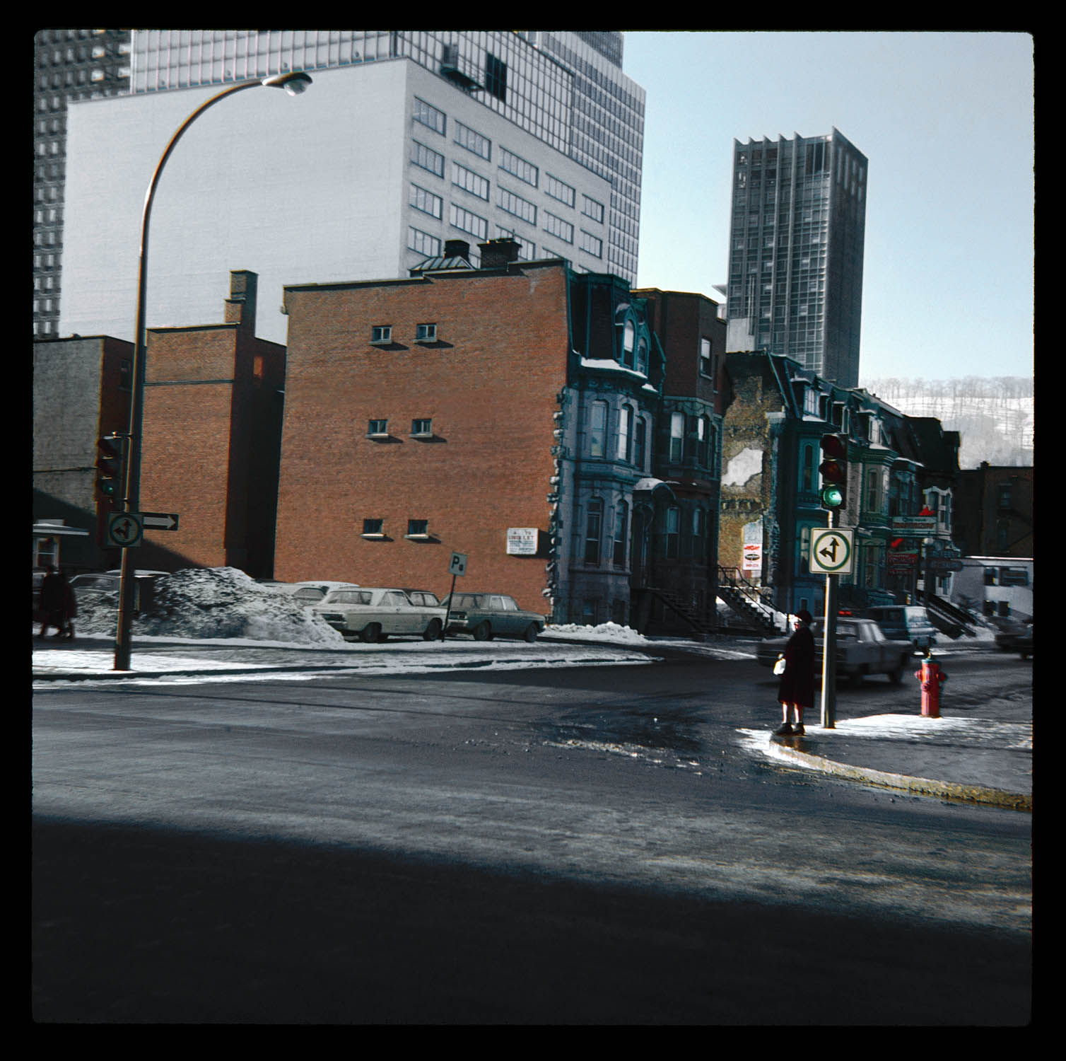 Unknown photographer (Australian) Downtown Montreal, intersection of Blvd de Maisonneuve Ouest and Metcalfe St, looking toward Mont Royal 1960s Ektachrome medium format transparency scanned