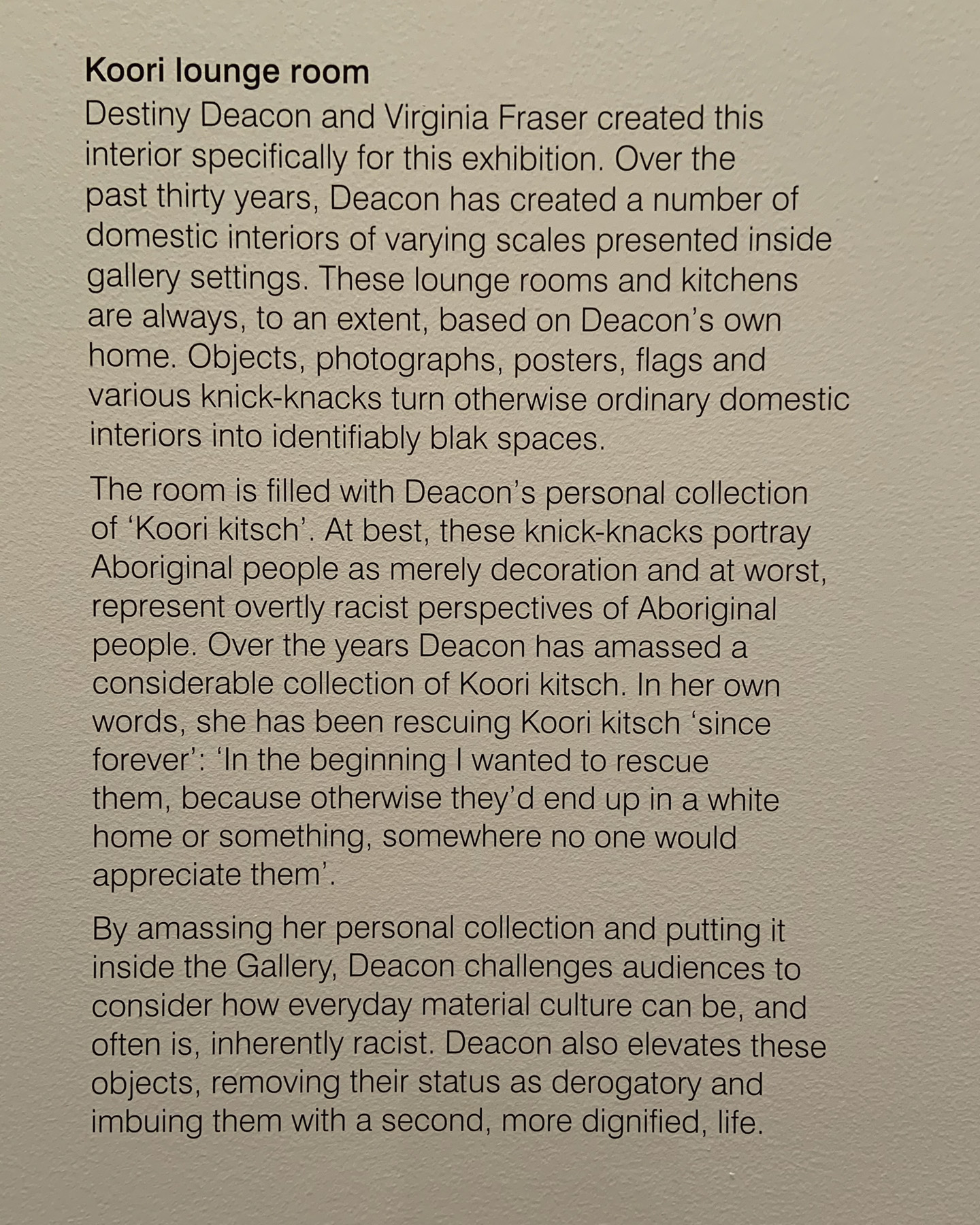 It is interesting to note that when looking through the art works in this exhibition – nearly all of which can be seen in this posting – how much of it is (historical) white art and how much of it is contemporary Aboriginal art, with a sop being made to art made by, or mentioning, other people including Chinese, Afghan, Muslim and Sudanese. Chinese people have been living in Australia for centuries, Afghan people similarly. Greek and Italian people arrived in droves in the 1950s-1960s, Vietnamese boat people in the 1970s, Sudanese, Indian and Sri Lankan people in the late 20th century. More (historical and contemporary) work from these people was needed in this exhibition because they inform the construction of modern Australian identities.