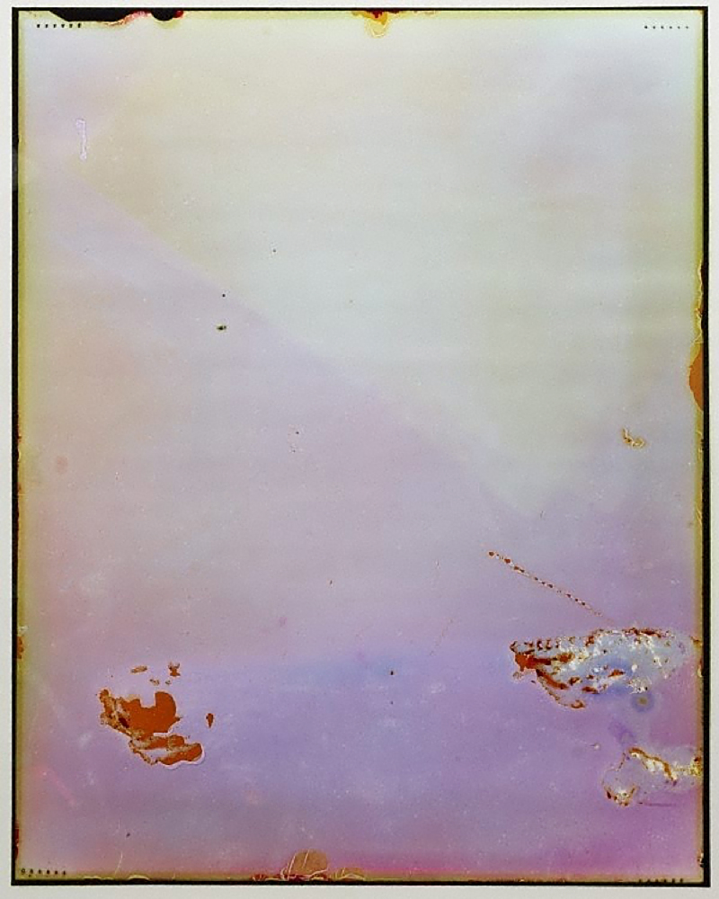 Australian artist Justine Varga creates photographic works from an intimate and often prolonged exchange between a strip of film and the world that comes to be inscribed on it. Desklamp involved the year-long exposure of a large format negative placed on top of the artist’s desk lamp. Exit was derived from a similar piece of film that was scarred and weathered during a three-month exposure on her windowsill during a residency in London. Both were then turned into luscious colour photographs in the darkroom via various printing procedures.