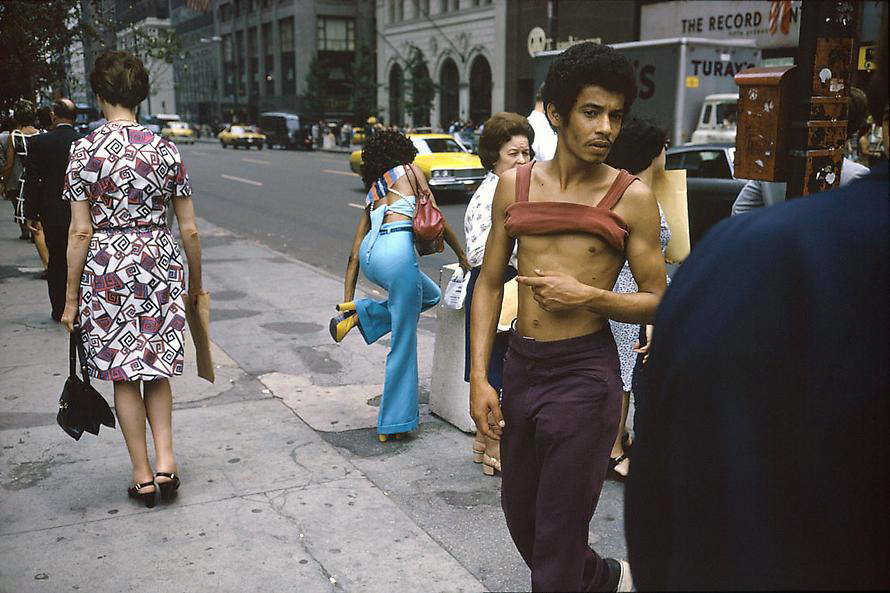 The hyperreal colours and placement of figures are crucial to this ocular obsession. Look at the image Gold corner, New York City (1974) and observe the precise, choreographed placement of the figures and how the colours flow, from orange/brown to green/blue and onto turquoise/red and polka dot, the central figure’s eyes shielded under a wide-brimmed hat, hand to head, model style. This is colour porn for the eyes. And Meyerowitz does it so well… the stretch of thigh and shadow in Los Angeles Airport, California (1976), the classic red of Truro (1976) or the bare midriff and raised yellow heel in New York City, 42nd and Fifth Ave (1974).