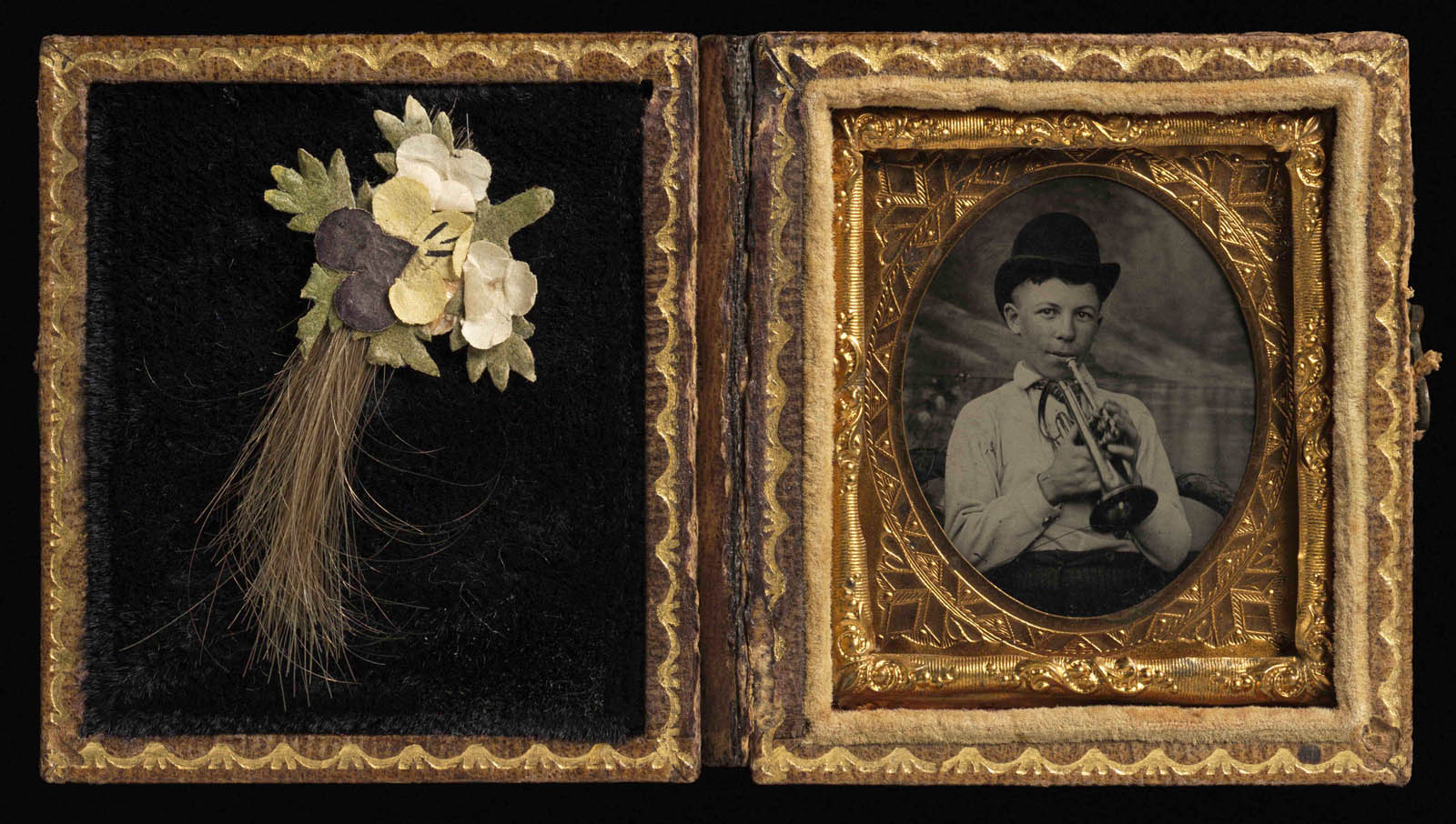 Unknown Maker (American) Musician 1870s Tintype, with lock of hair and cut paper Case (open): 2 × 3 1/2 in. (5.1 × 8.9cm) The Metropolitan Museum of Art, William L. Schaeffer Collection Promised Gift of Jennifer and Philip Maritz, in celebration of the Museum’s 150th Anniversary