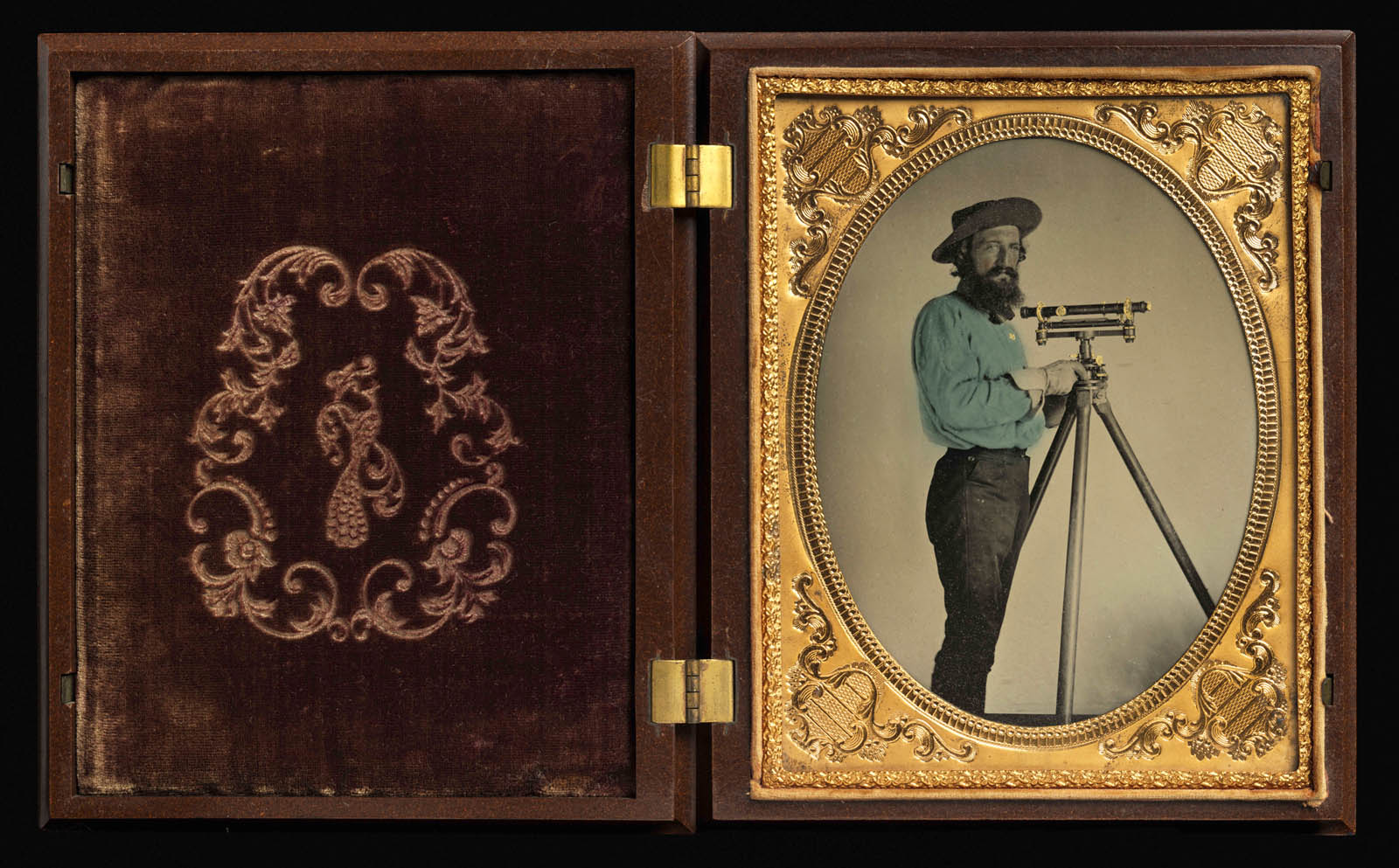 Unknown Maker (American) Railroad Worker (?) with Wye Level c. 1870 Tintype with applied color Case (open): 6 5/16 × 10 3/8 in. (16 × 26.4cm) The Metropolitan Museum of Art, William L. Schaeffer Collection Promised Gift of Jennifer and Philip Maritz, in celebration of the Museum’s 150th Anniversary