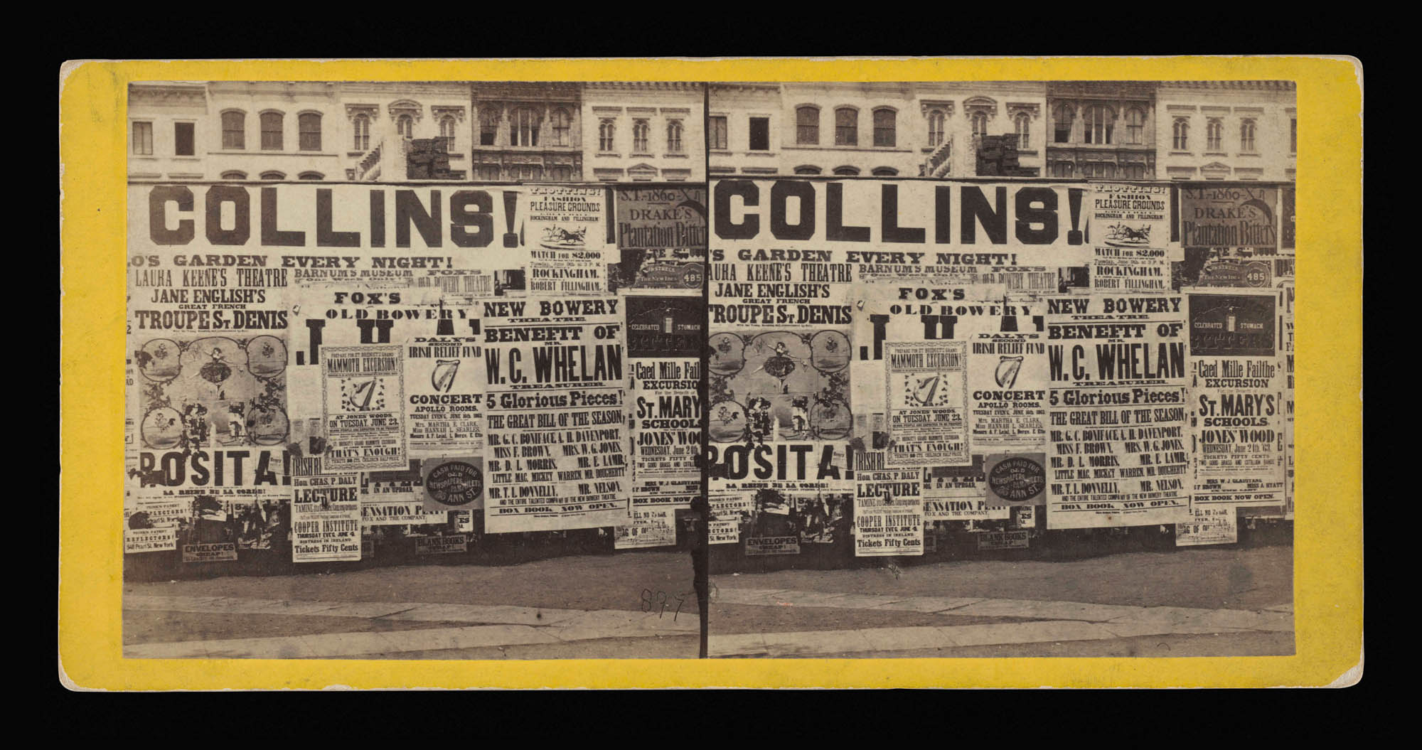 Unknown Maker (American) Published by E. & H. T. Anthony (American, 1862-1880s) Specimens of New York Bill Posting, No. 897 from the series “Anthony’s Stereoscopic Views” 1863 Albumen silver print from glass negative Mount: 3 1/4 × 6 3/4 in. (8.3 × 17.1 cm) The Metropolitan Museum of Art, William L. Schaeffer Collection Promised Gift of Jennifer and Philip Maritz, in celebration of the Museum’s 150th Anniversary