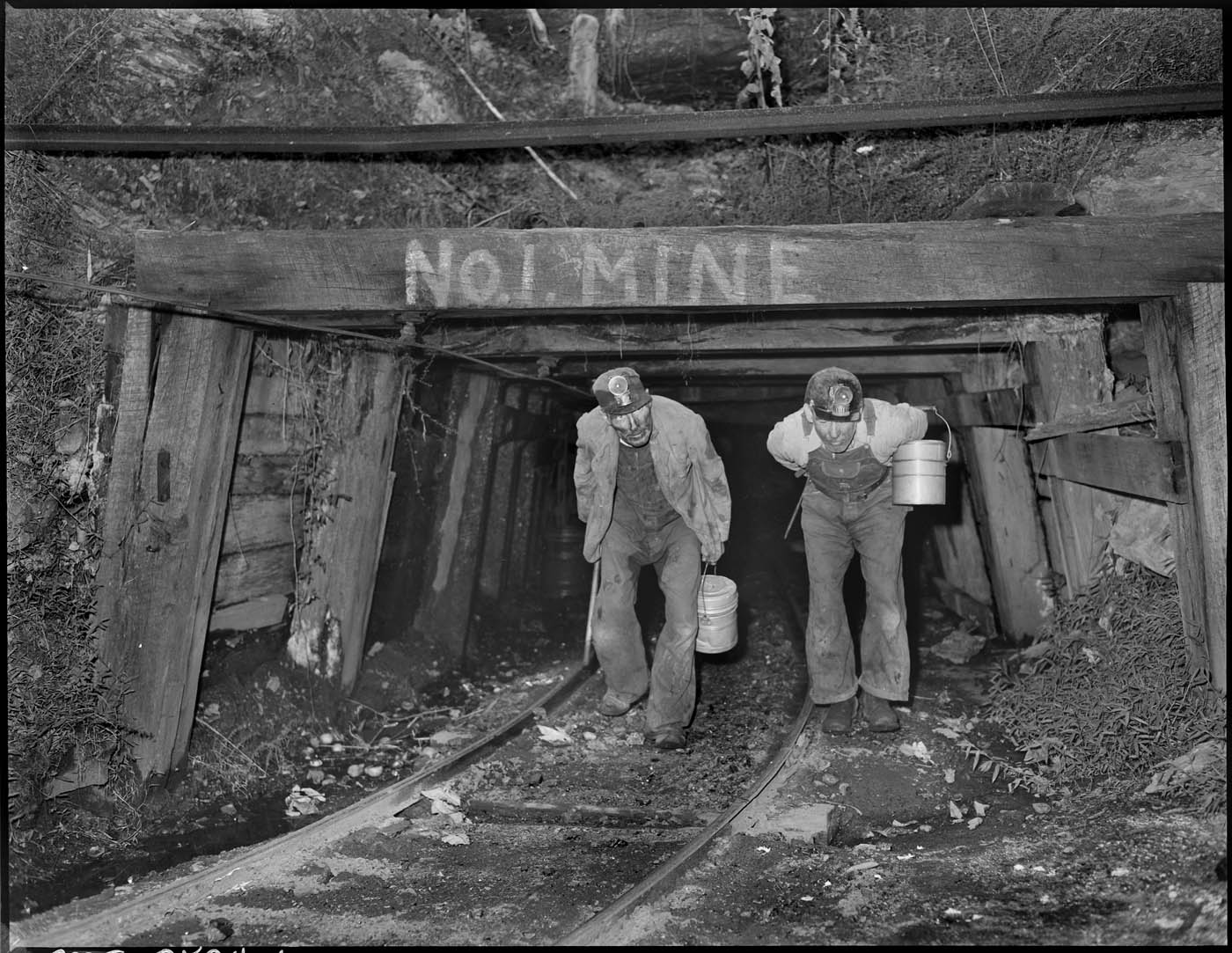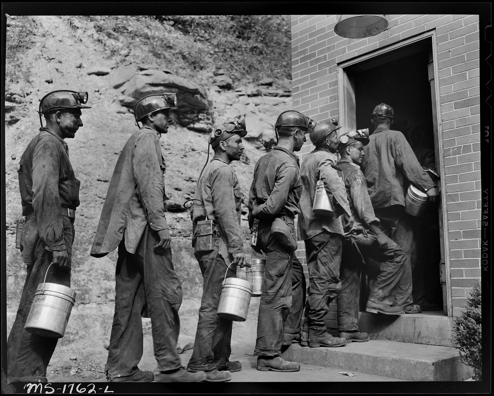 Russell Lee (American, 1903-1986) Blaine Sergent, left, comes out of the mine at the end of the day’s work. P V & K Coal Company, Clover Gap Mine, Lejunior, Harlan County, Kentucky September 13, 1946 National Archives Public domain