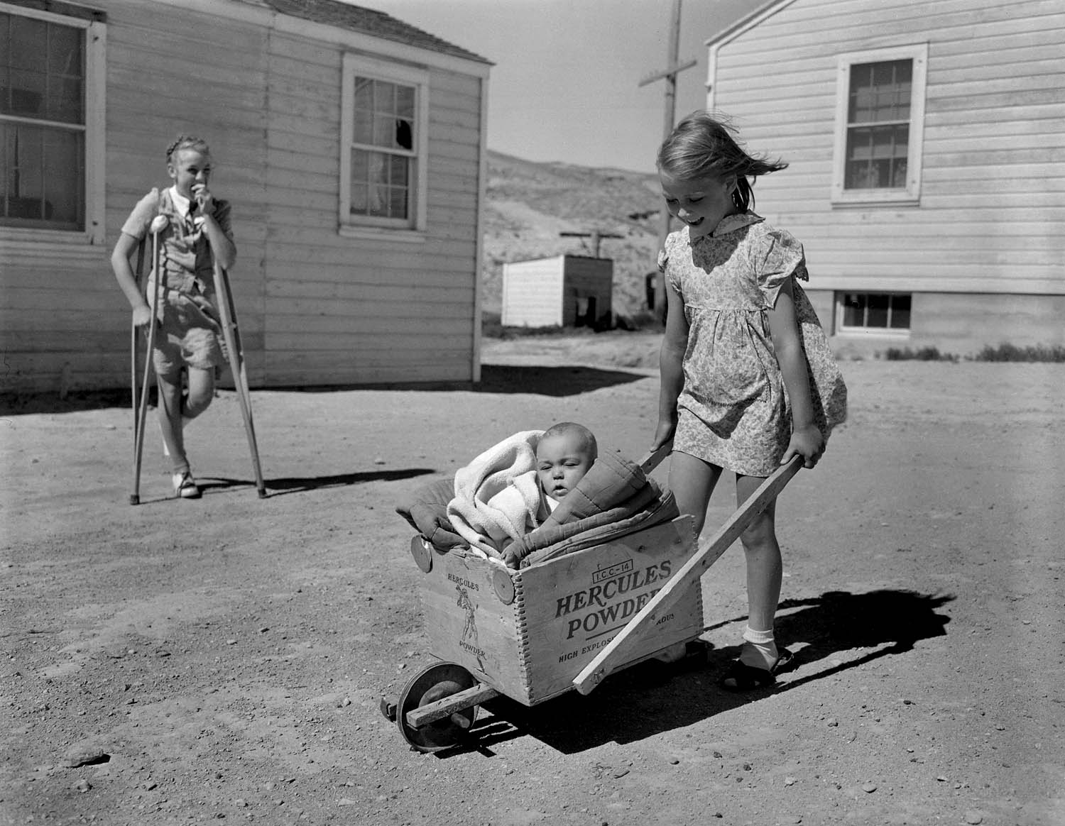 Russell Lee (American, 1903-1986) Children of miner living in company housing project. Note the homemade baby buggy made of a powder box. Union Pacific Coal Company, Reliance Mine, Reliance, Sweetwater County, Wyoming (Original Caption) August 10, 1946 National Archives Public domain