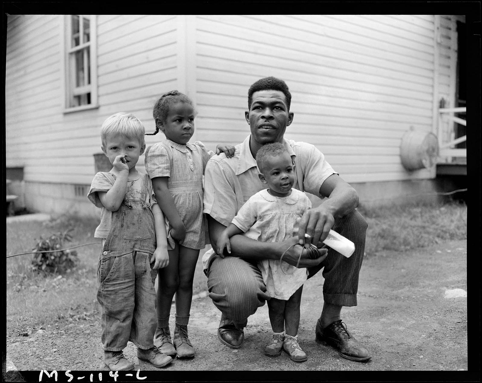 Russell Lee (American, 1903-1986) Gonzalla Sullivan, miner, with his two children and another child who lives in the neighborhood. Koppers Coal Division, Federal #1 Mine, Grant Town, Marion County, West Virginia June 13, 1946 National Archives Public domain