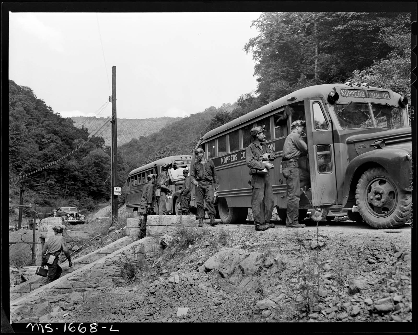 Russell Lee (American, 1903-1986) Miners boarding buses which will take them to washhouse from lamp house where they have checked out. Koppers Coal Divison, Kopperston Mine, Kopperston, Wyoming County, West Virginia August 20, 1946 National Archives Public domain