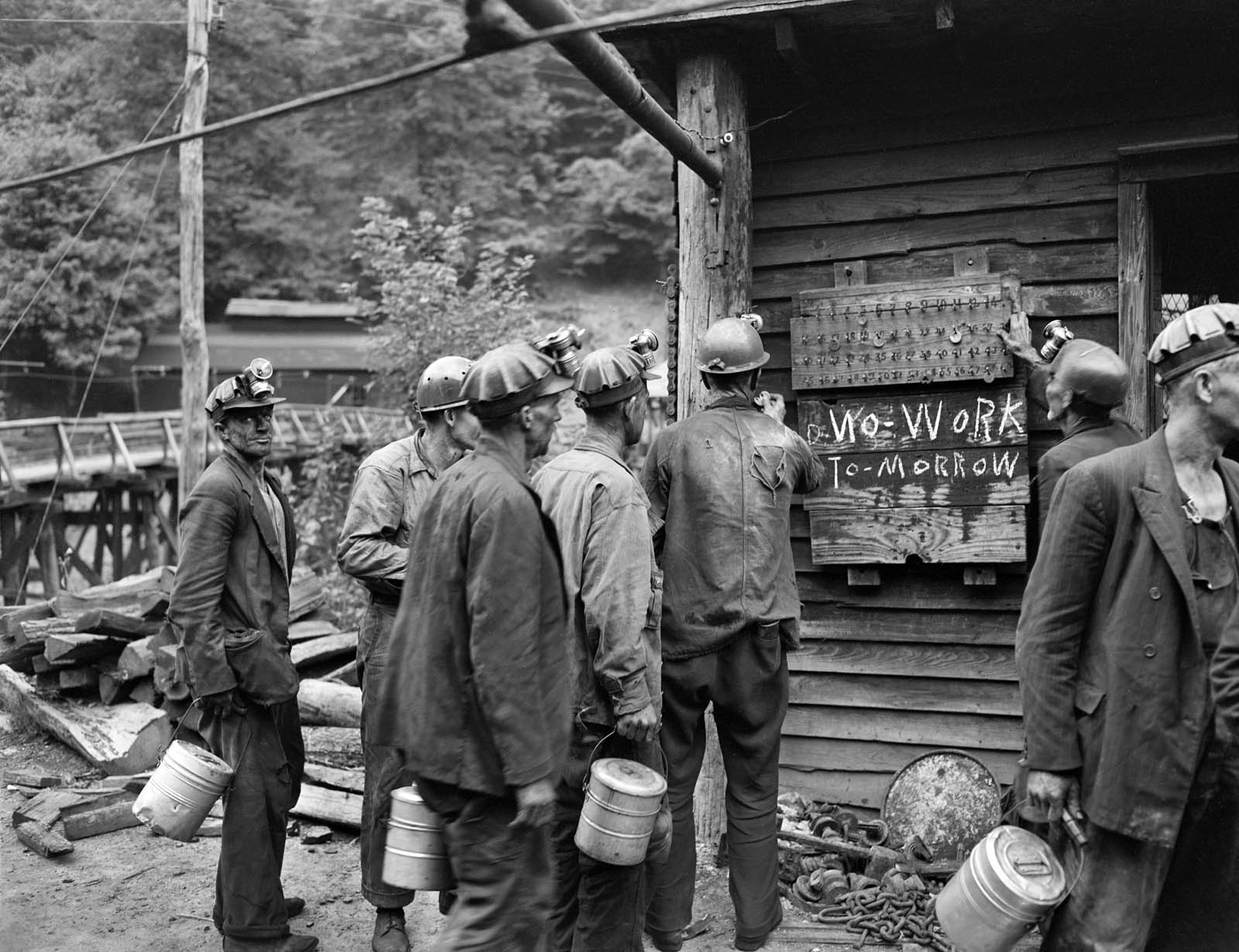 Russell Lee (American, 1903-1986) Miners bring in their checks and see the sign that there is no Saturday work. P V & K Coal Company, Clover Gap Mine, Lejunior, Harlan County, Kentucky (Original Caption) September 13, 1946 National Archives Public domain