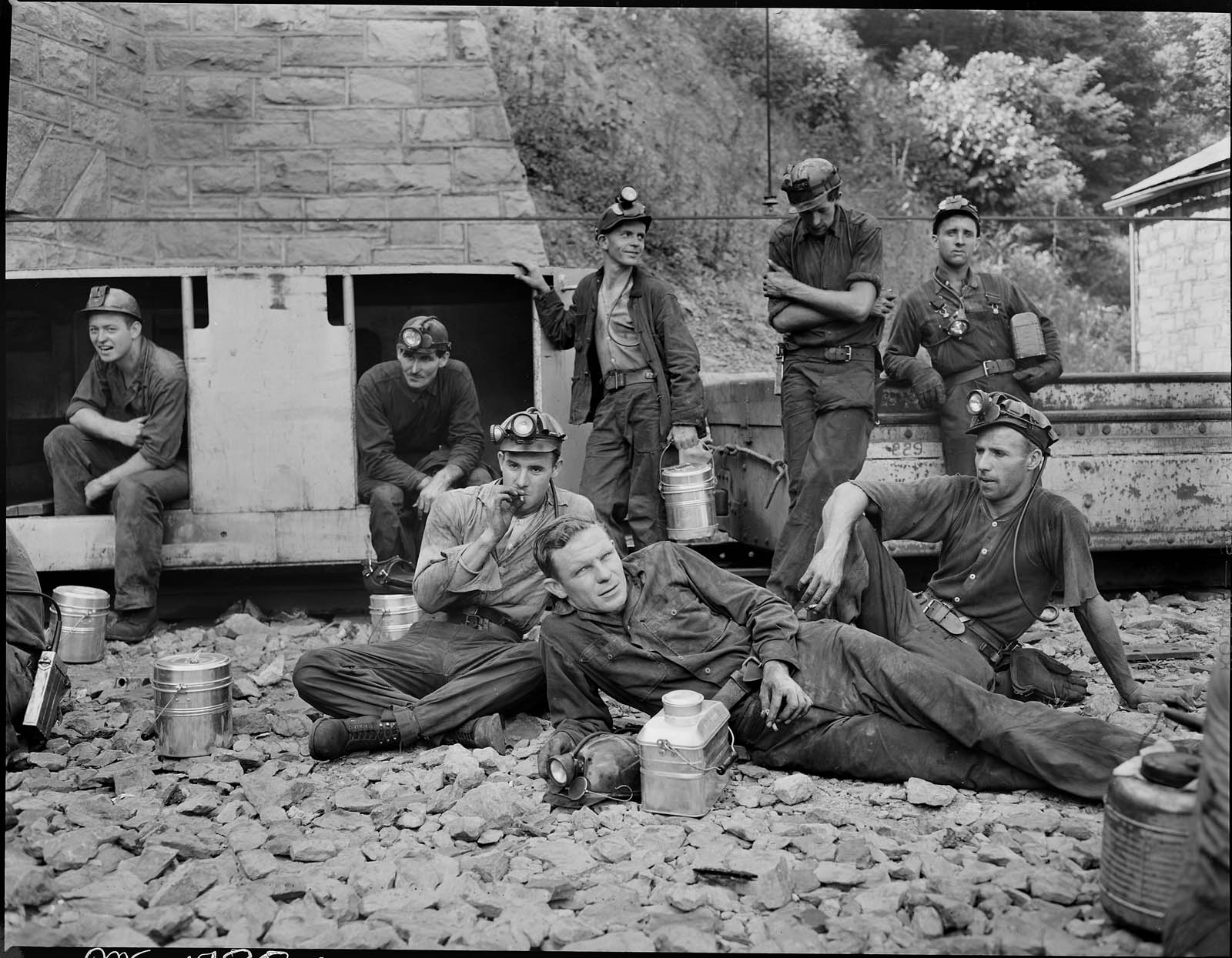 Russell Lee (American, 1903-1986) Miners waiting at drift mouth for the afternoon man trip. Koppers Coal Divison, Kopperston Mines, Kopperston, Wyoming County, West Virginia August 22, 1946 National Archives Public domain