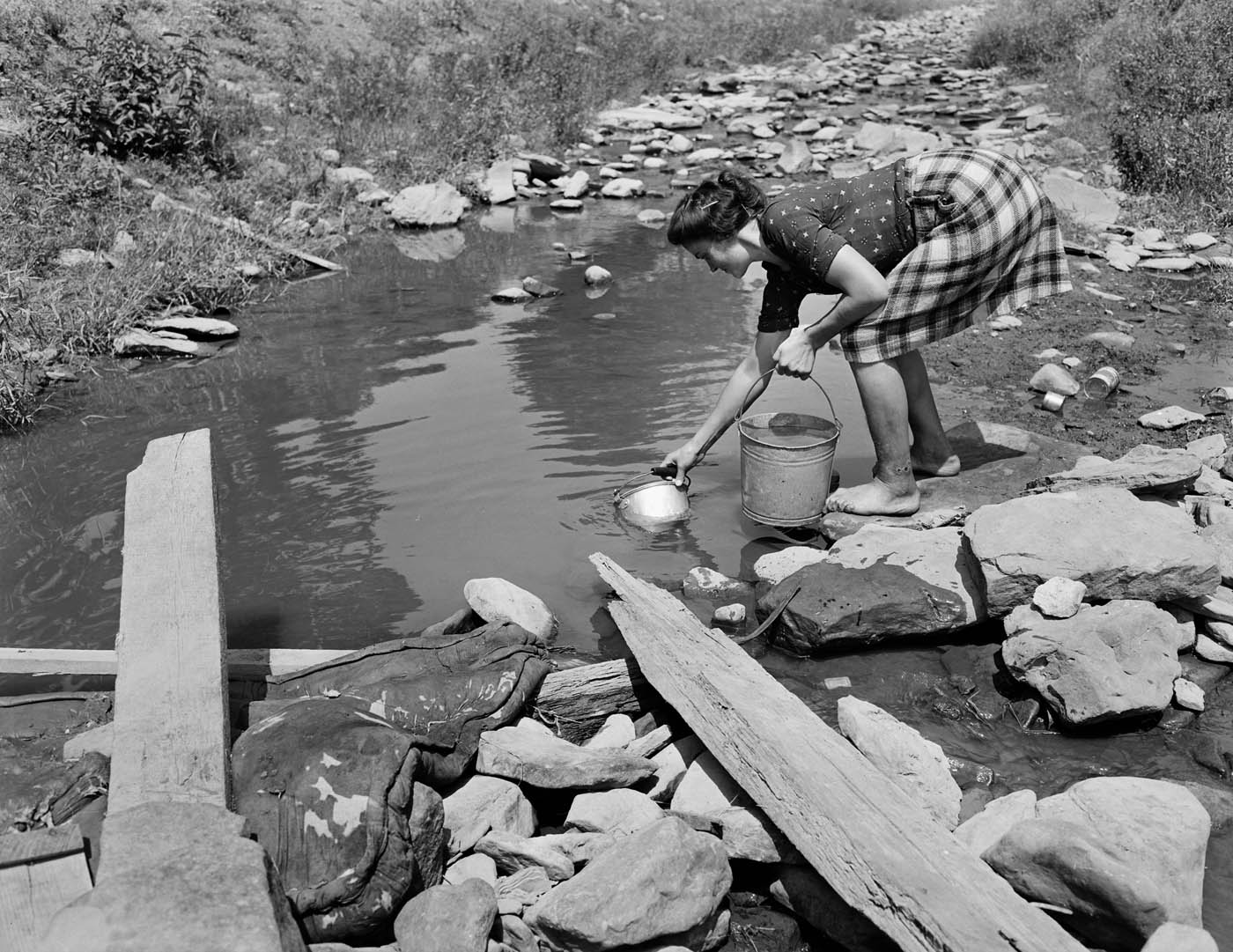 Russell Lee (American, 1903-1986) Mrs. Edna Lingar getting wash water from dirty stream; stock wade this stream, privies drain into it, garbage decay in it, a dead animal was in the stream about fifteen feet above where she was getting water. Kentucky Straight Creek Coal Company, Belva, Mine, abandoned after explosion, Four Mile, Bell County, Kentucky (Original Caption) September 4, 1946 National Archives Public domain