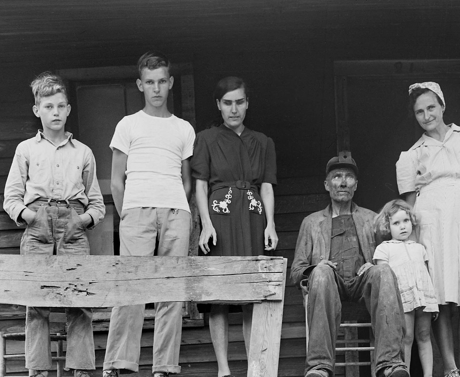 Russell Lee (American, 1903-1986) The Sergent Family on their front porch. Reading from L. to R., Franklin D., Louis, Lucy, Mr. Blaine Sergent, Bobbie Jean, Mrs. Sergent, Wanda Lee and Donald. Mr. and Mrs. Sergent have two married sons living nearby, Rufus, who lives next door and is a coal cutter in the same mine and Junior who lives and works at Verda Mine several miles away. P V & K Coal Company, Clover Gap Mine, Lejunior, Harlan County, Kentucky September 15, 1946 National Archives Public domain