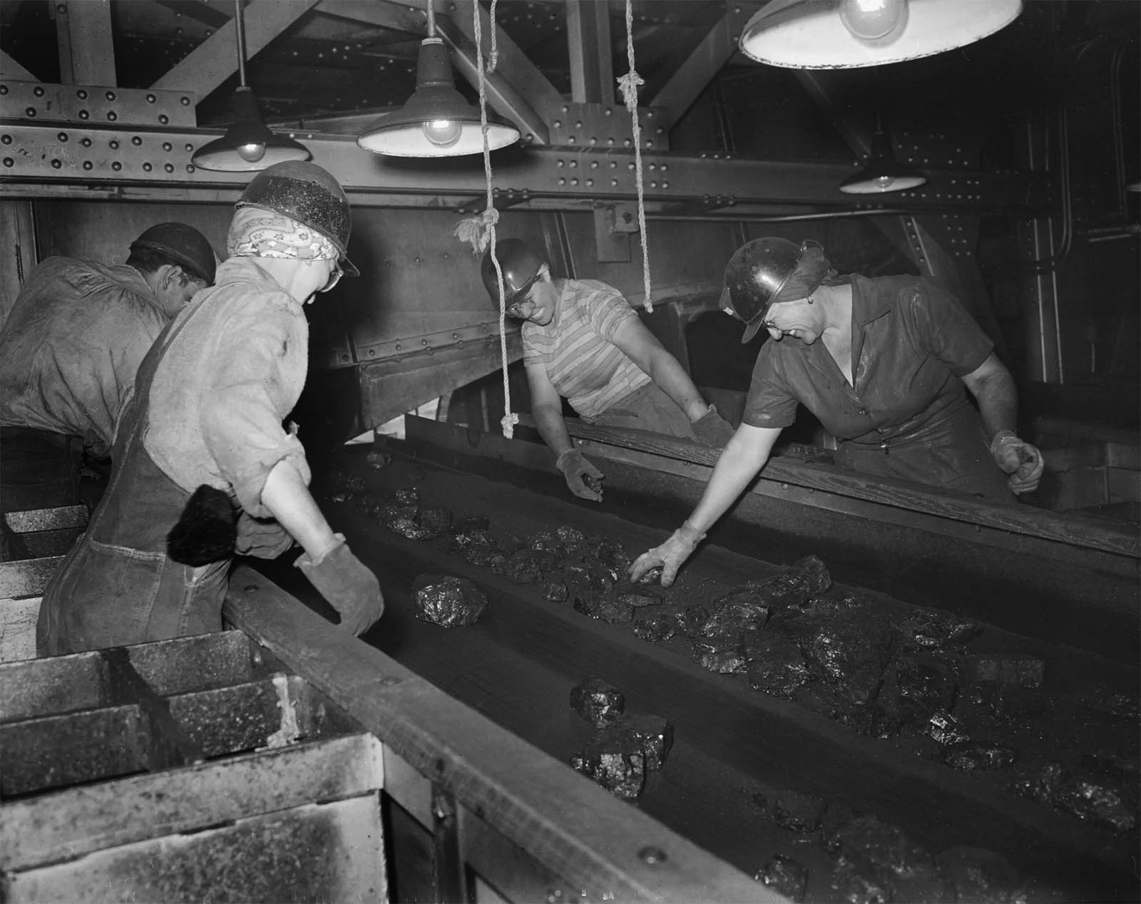 Russell Lee (American, 1903-1986) Women pick foreign matter out of coal as it is carried on conveyor thru tipple. Union Pacific Coal Company, Stansbury Mine, Rock Springs, Sweetwater County, Wyoming (Original Caption) July 10, 1946 National Archives Public domain