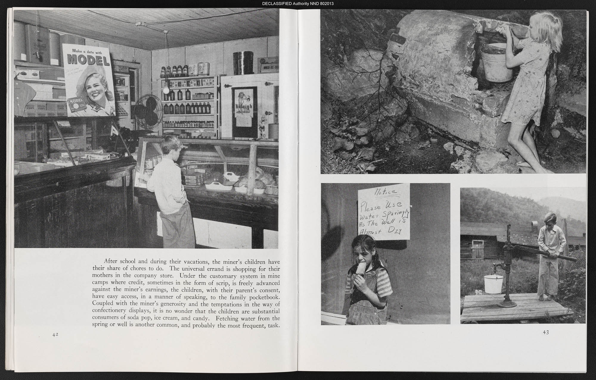 Having worked through the Second World War to aid the American war effort, men and women were hard at work in a dangerous job, the families were living in run down houses owned by the coal mining companies, were buying food at the company store, were borrowing money on their earnings from the company to survive and living a subsistence life – having the minimal resources necessary for survival, having just enough food or money to stay alive. Rickety wooden houses with no running water [The only houses with running water inside in this camp are those in which their tennants [sic] have made the installations at no expense to the company], dead animals in streams where water is gathered, roofs lined with newspaper, children with no shoes, men holding serpents praying to an unseen god.