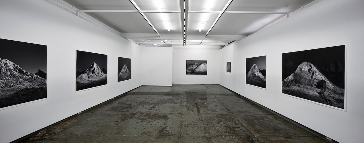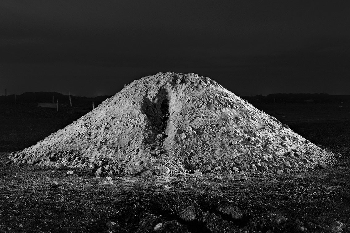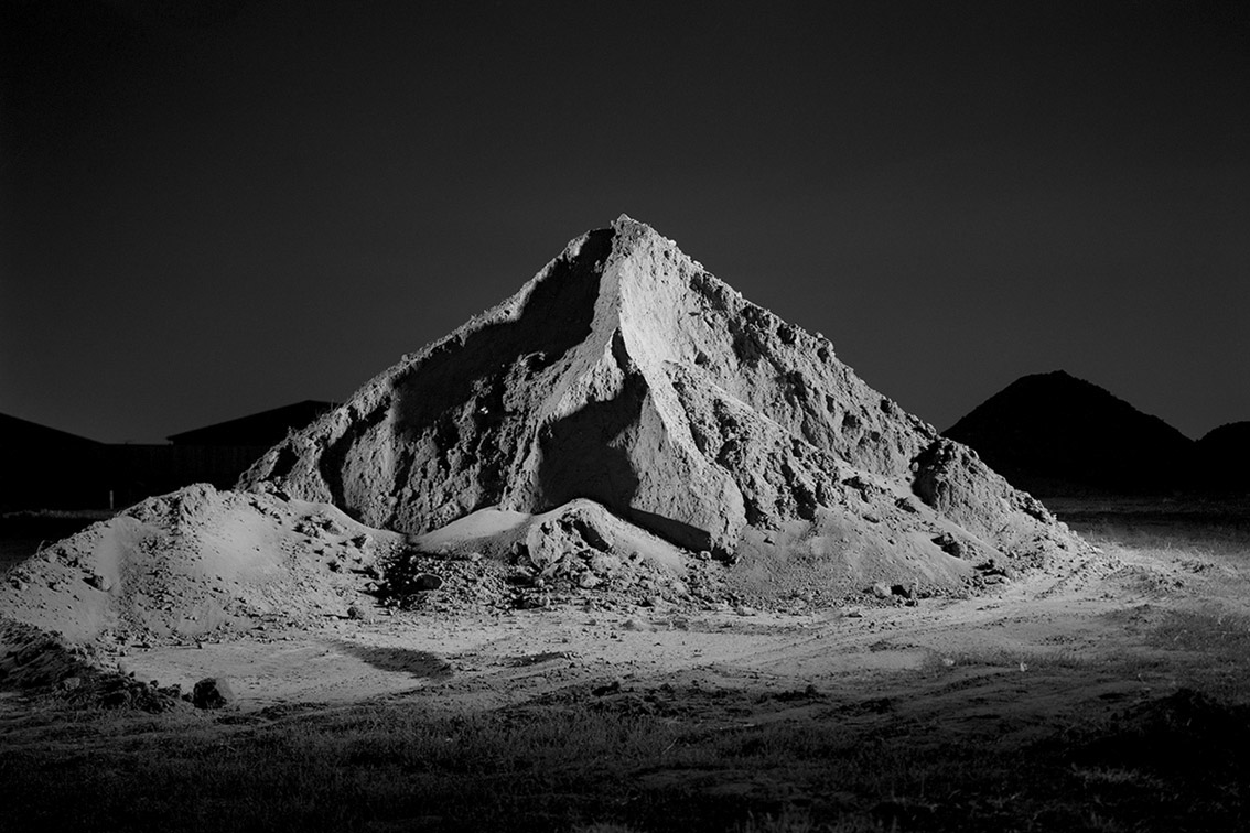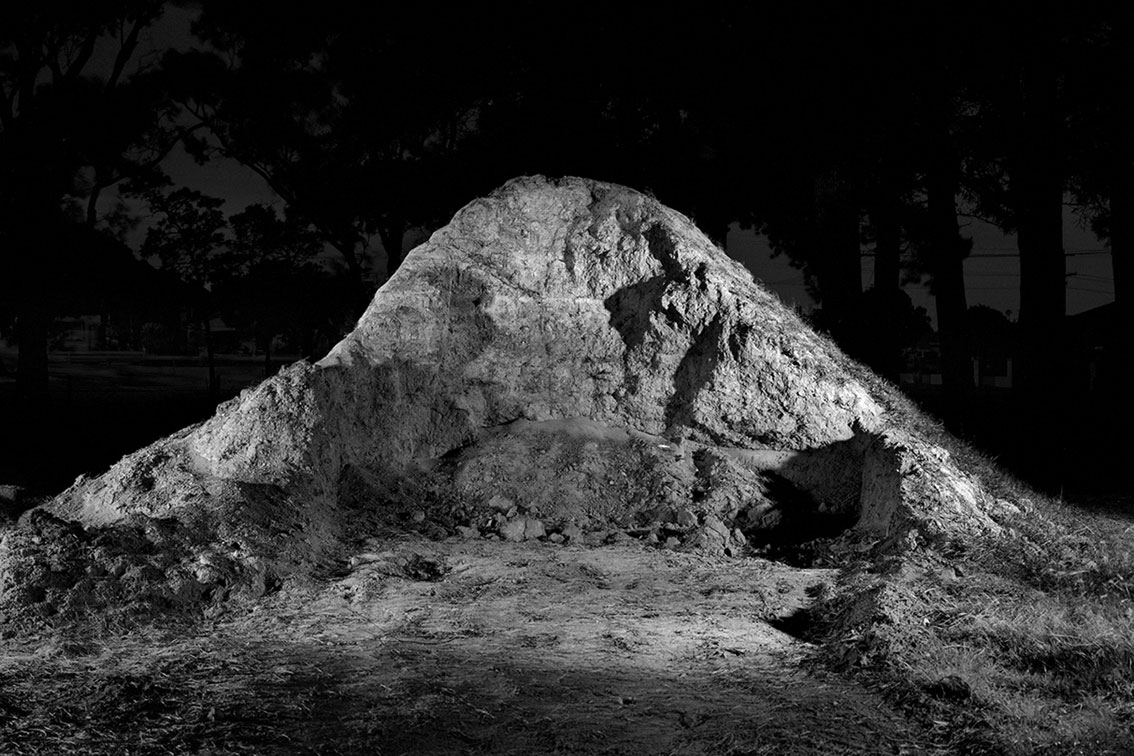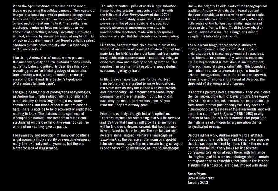 This is a strong exhibition of large scale hybrid black and white photographs by Andrew Curtis at Blockprojects, Cremone. The photographs look grand in the simple, beautiful exhibition space, perhaps too grand, too sympatico with the theme of the work: mountains made out of piles of earth dumped at building sites in the outer suburbs of Melbourne. There is humour and absurdity here as Dan Rule notes, but also more than a hint of the sublime. By playing with scale (narratives of the miniature, the gigantic) and light (these images have been studiously lit from different angles during a long time exposure), Curtis tricks the eye of the viewer, just for a split second (the punctum?), elucidating “the strength of the almost blinding role that expectation plays in our reading of an image.” (Dan Rule)