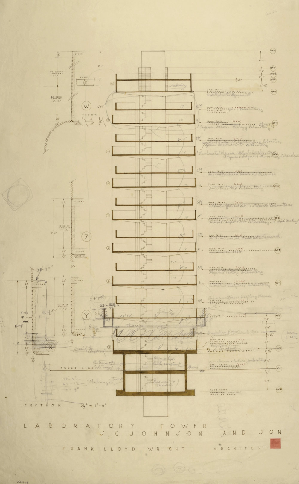 Perspective with Wright’s Golden Beacon Apartment Building project (1956-1957)