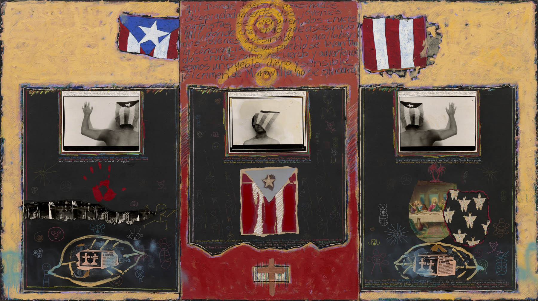 Juan Sánchez, the influential Nuyorican visual artist, teacher, writer, and curator once declared “Political art is a medium used as a weapon to hopefully recapture or regain the positive energy of celebration – to regain the goodness of humanity.” Sánchez, the child of Puerto Rican immigrants, was born and raised in Brooklyn. Encompassing a variety of mediums and techniques, including collage, painting, printmaking, photography, and video, his work is informed by his activism and engagement with issues of colonialism and its legacy, race, class, cultural identity, equality, social justice, and self-determination. At the same time, he has maintained a consistent focus on communities, families, and both personal and political histories in his work.