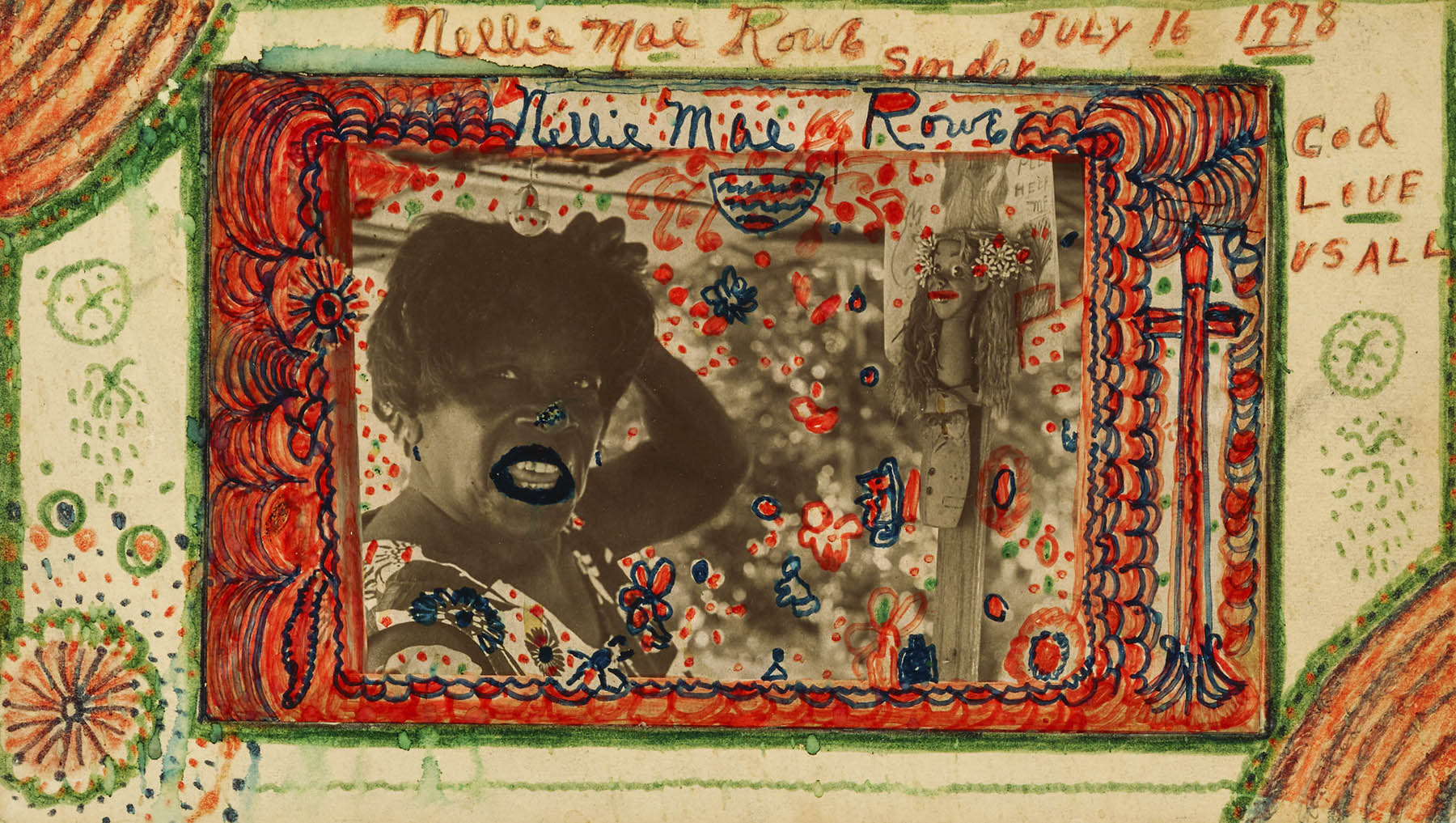 Rowe saw art-making as a God-given way to convey gratitude and recover a girlhood lost to labor and poverty. She transformed her property into an enriched realm she called her “Playhouse,” embellished with artworks and found objects that brought a heightened animation to her surroundings. Amid a society that rarely featured Black women in works of art and cast them as demeaning stereotypes in popular culture, Rowe took control of the narrative. She depicted friends, neighbours, and herself in drawings and hand-coloured photographs, confident images of Black beauty and free-spirited joy. In a radical act of reclamation, she crafted a world where cultural pride, personal style, and a bit of the unexpected embody the richness of life.