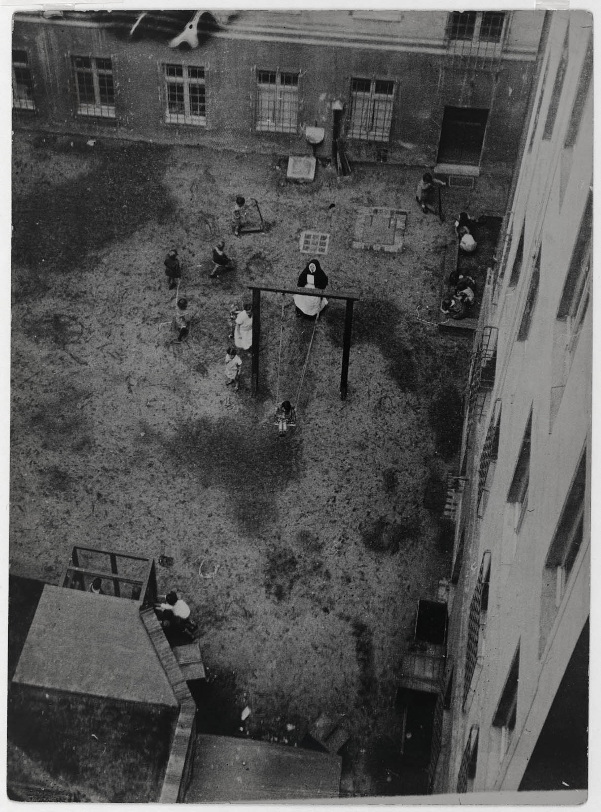 Umbo – born Otto Umbehr – found his expressive tool in the camera in 1926. In the early 1920s he studied at the Bauhaus with the intention of becoming a painter, until Walter Gropius, the director of the Institute, expelled him from the school for improper conduct. He then found in photography the medium that allowed him to work with his distinctive play of light and shadow. Photographs such as Unheimliche Straße (Eerie Street, 1928), Am Strand (auch Strandleben) (On the beach [also beach life], 1930) and Ohne Titel (Kindergarten) (Untitled [Kindergarten], 1930) epitomize his artistic innovations. There is nothing random in these images: everything has been composed. Umbo’s photographs are the opposite of snapshots or shots that capture the emotion of a moment; they express a formal intent without overpowering reality. Therefore, with all their poetry, they retain an abstract component. What clearly surfaces in this primacy of composition is his connection to the Bauhaus philosophy, which emphasised design and structure over emotion or spontaneity.