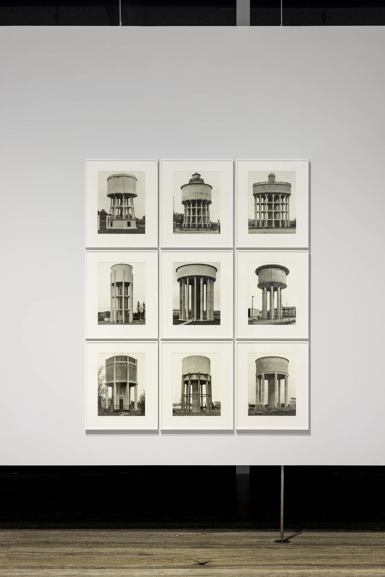 Installation view of the exhibition Typologien: Photography in 20th-century Germany at Fondazione Prada, Milan showing Bernd and Hilla Becher’s Wassertürme (Water towers) 1966-1986