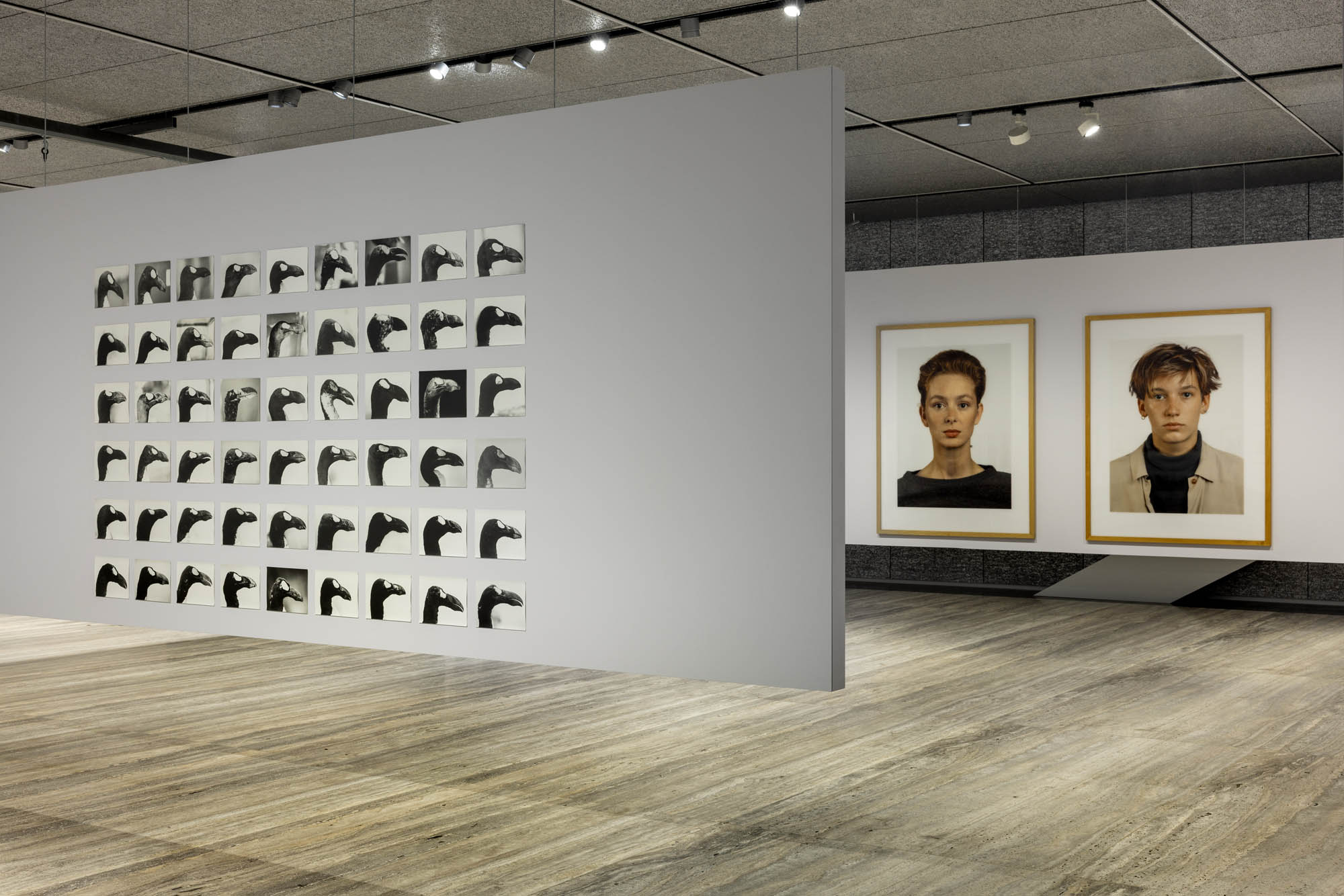 Installation view of the exhibition Typologien: Photography in 20th-century Germany at Fondazione Prada, Milan showing the work of Thomas Struth with at left, Musée du Louvre IV Paris, 1989
