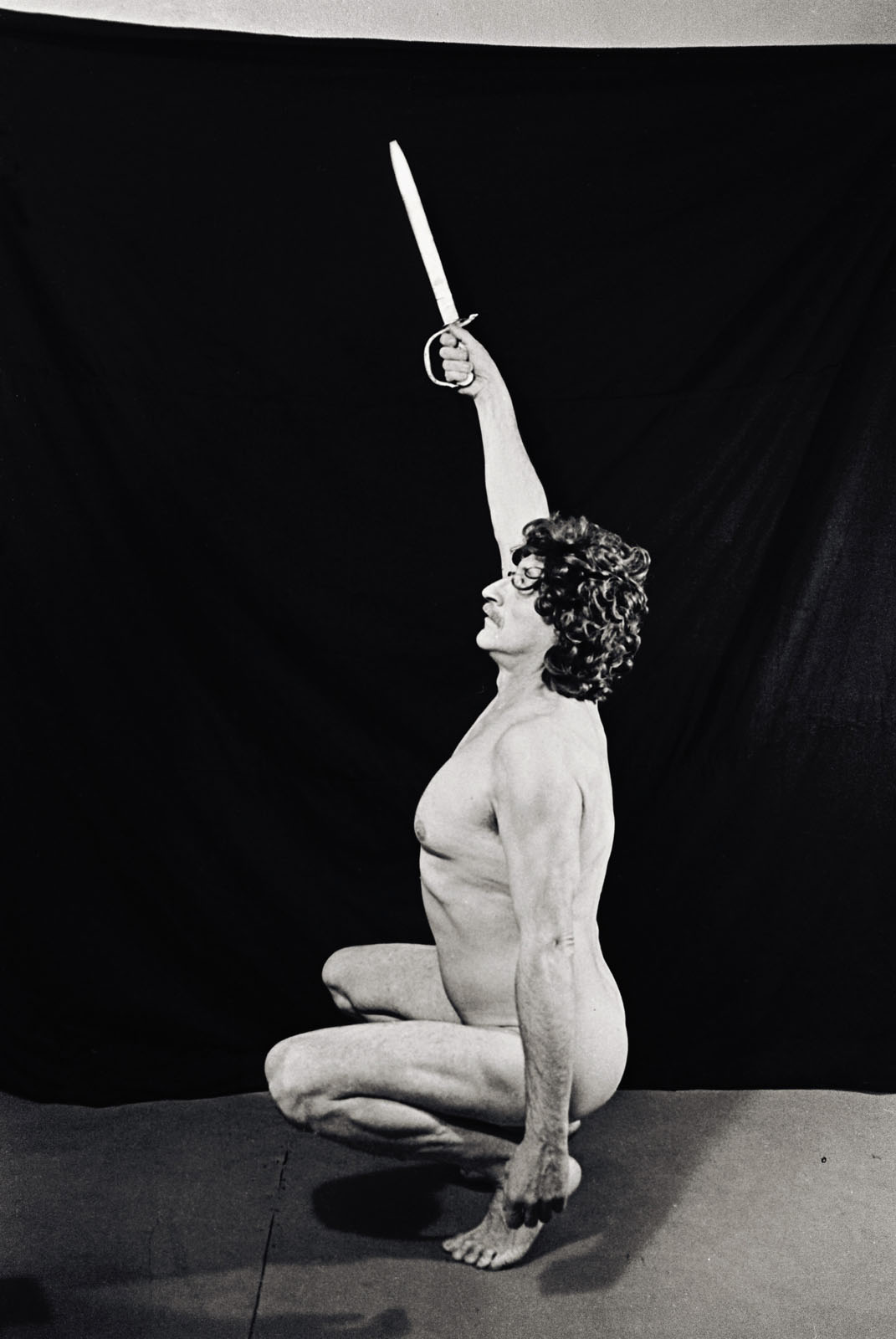 In provocative, dramatically-lit black-and-white images, the naked artist plays the role of anti-hero in burlesque, self-deprecating self-portraits that mock the traditional masculine stereotype idealised by the Soviet regime. At times recalling Buster Keaton or pantomime artist Marcel Marceau, he dons a curly black wig, brandishing a sword or artificial phallus or holding an enema bag; exposing his ageing, vulnerable body, “trying on the icons of Western mass culture, like Rambo,” he assumes pseudo-athletic or contemplative poses that call to mind works by Rodin or Caravaggio. The images are presented here in a composition imagined by the artist especially for the MEP with vintage prints from his archives.