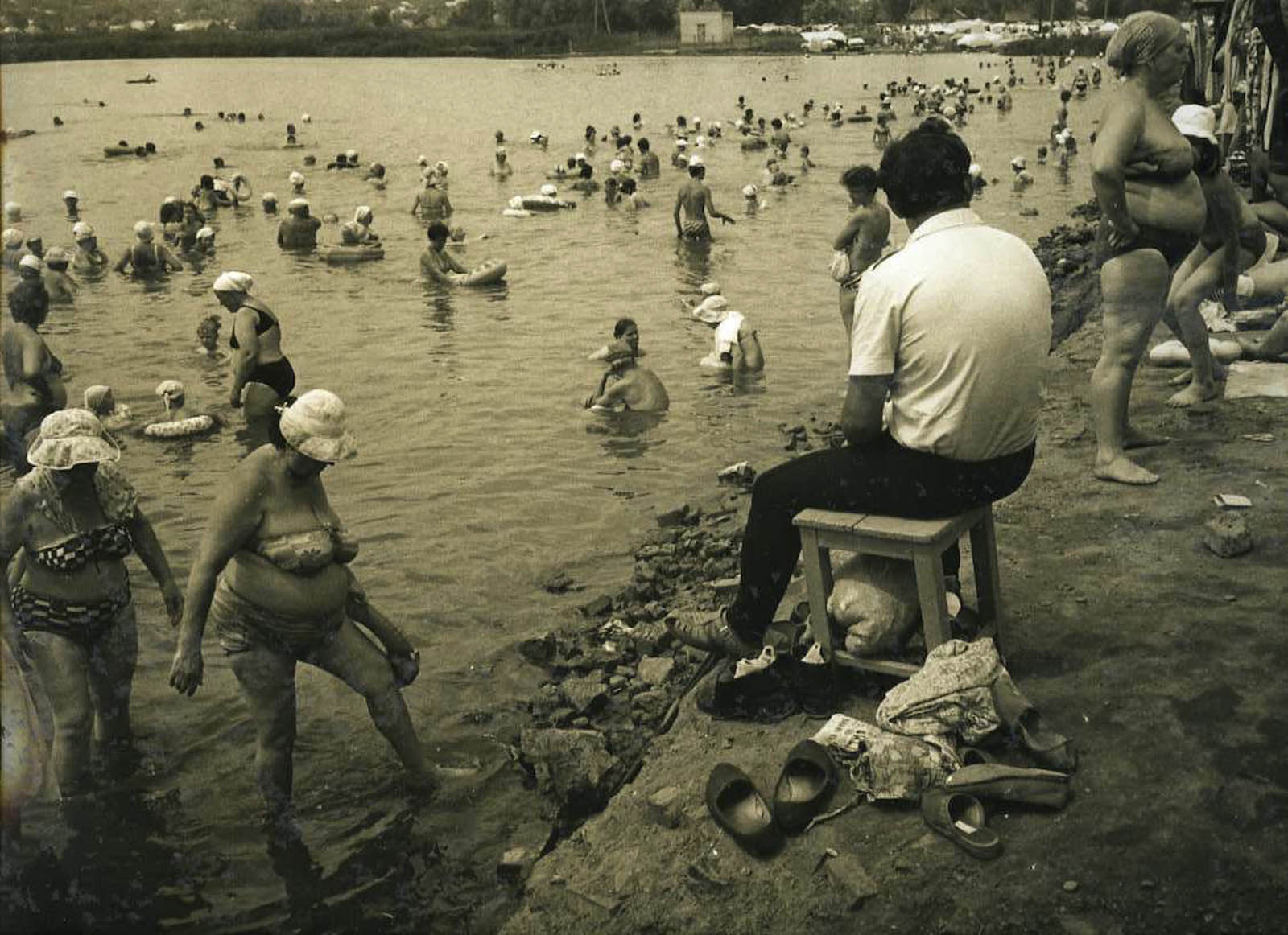 Mikhailov’s large-format sepia prints of bathers were taken on the edge of a lake in Sloviansk, his father’s native city, in the Donbass region of southern Ukraine, whose inhabitants, he was told, were convinced the warm, salty water had healing properties. He found a popular bathing spot where little suggested anything salubrious: a murky, heavily polluted industrial site surrounded by factories. Mikhailov’s clandestine photographs of these scenes in which families enjoying their “freedom” with total indifference to their surroundings are both compassionate and scathing.