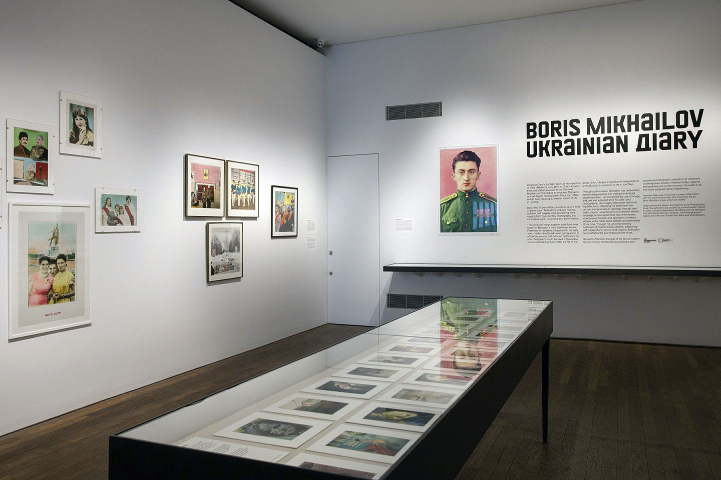 Installation view of the exhibition Boris Mikhailov: Ukrainian Diary at The Photographers’ Gallery, London showing photographs from his series Case History (1997-1998, below)
