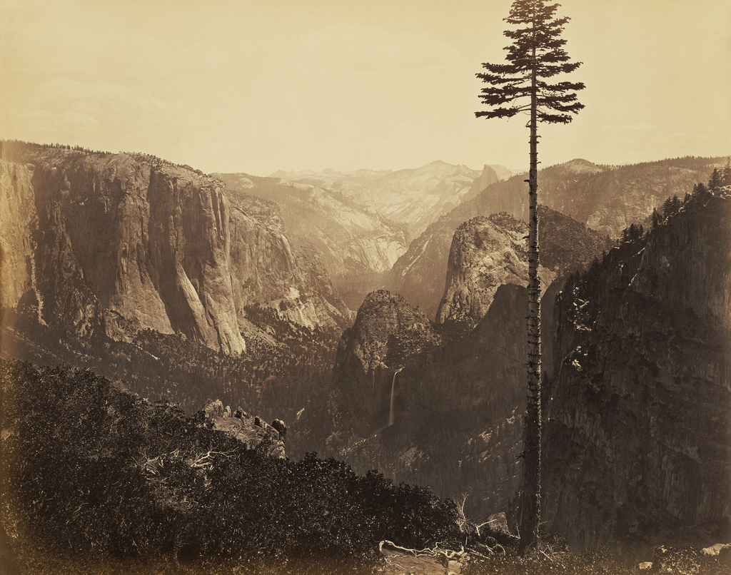 Carleton Watkins had the ability to photograph a subject from the viewpoint that allowed the most information to be revealed about its contents. In this image, he captured what he considered the best features of Yosemite Valley: Bridalveil Falls, Cathedral Rock, Half Dome, and El Capitan. By positioning the camera so that the base of the slender tree appears to grow from the bottom edge of the picture, Watkins composed the photograph so that the canyon rim and the open space beyond it seem to intersect. Although he sacrificed the top of the tree, he was able to place the miniaturised Yosemite Falls at the visual centre of the picture. To alleviate the monotony of an empty sky, he added the clouds from a second negative. This image was taken while Watkins was working for the California Geological Survey. His two thousand pounds of equipment for the expedition, which included enough glass for over a hundred negatives, required a train of six mules.
