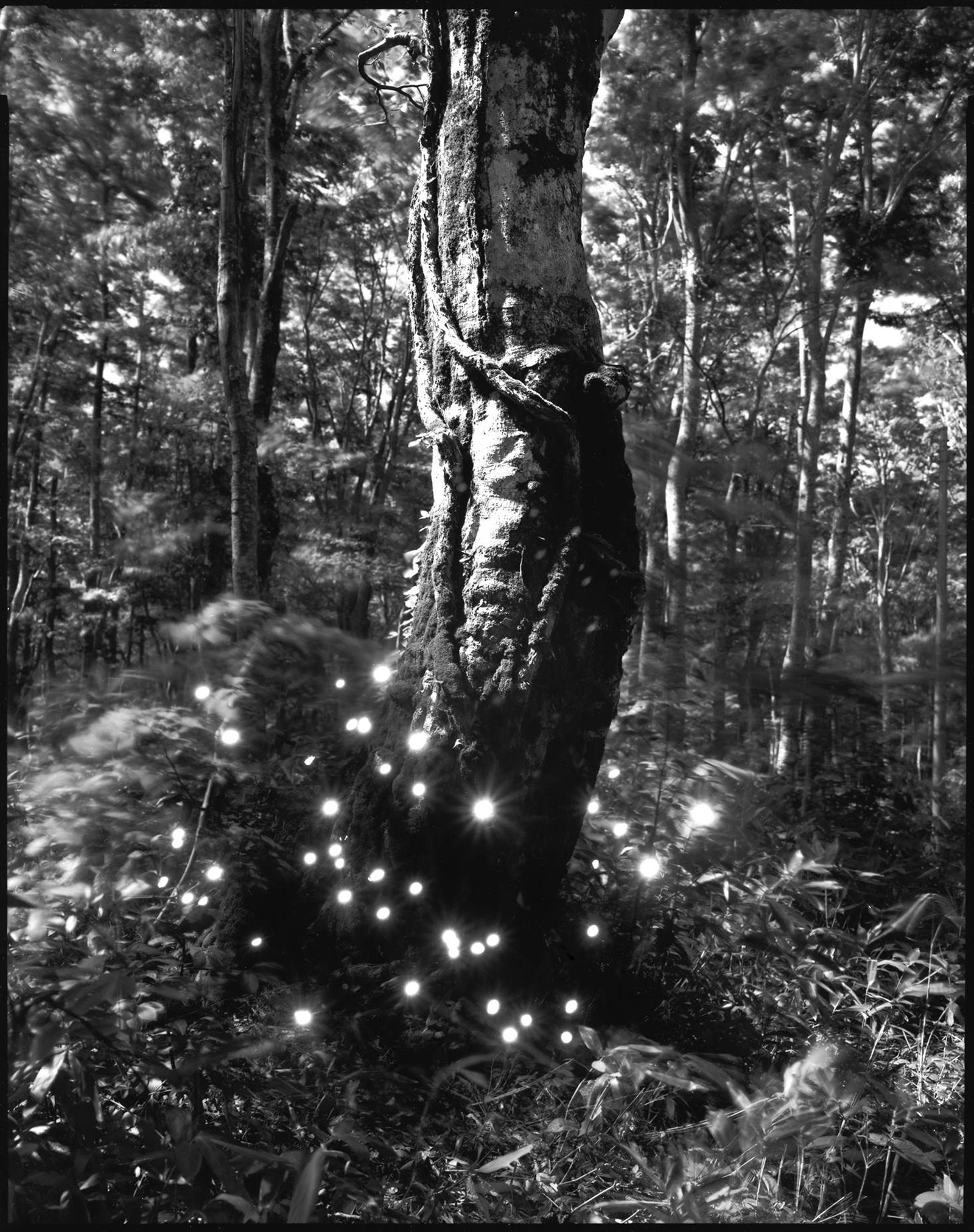 This photograph embodies Sato’s ephemeral imagination. It was made in the primeval Hakkoda forest, in northern Honshu on the main island of Japan. The image reveals a long fascination with the sculptural form of the Japanese Beech tree. Sato has said that to him ‘these trees suggest the ancient continental origins of the Japanese people while representing masculine strength and feminine sensitivity’. To make the picture, he exposed large-format film, during which he moved in front of the camera with a mirror reflecting the sun’s rays. The power of the sun momentarily ‘blinds’ the camera, creating an area that registers on film as an intense flare of light. Although we know that Sato is standing somewhere in the scene, we struggle to locate precisely where. While his traces are like pinpoint coordinates on a map, all we can do is estimate his continually moving location and follow the possible connecting trails. In this way, his photographs can be seen as enigmatic sculptural or physical performances. Knowing how Sato makes his images, we recognise there is not a multiplicity of presences indicated by the lights, but instead a multiplicity of one presence: the artist’s. His omnipresence might be a hint of some kind of divinity: the ever-present force of an invisible creator. Or it may simply be a record of the movement of one human force. However it is interpreted, human or divine, the light is a kind of mark that asserts both transcendence and specificity: “I was here,” even if, as in life, it is only momentarily.