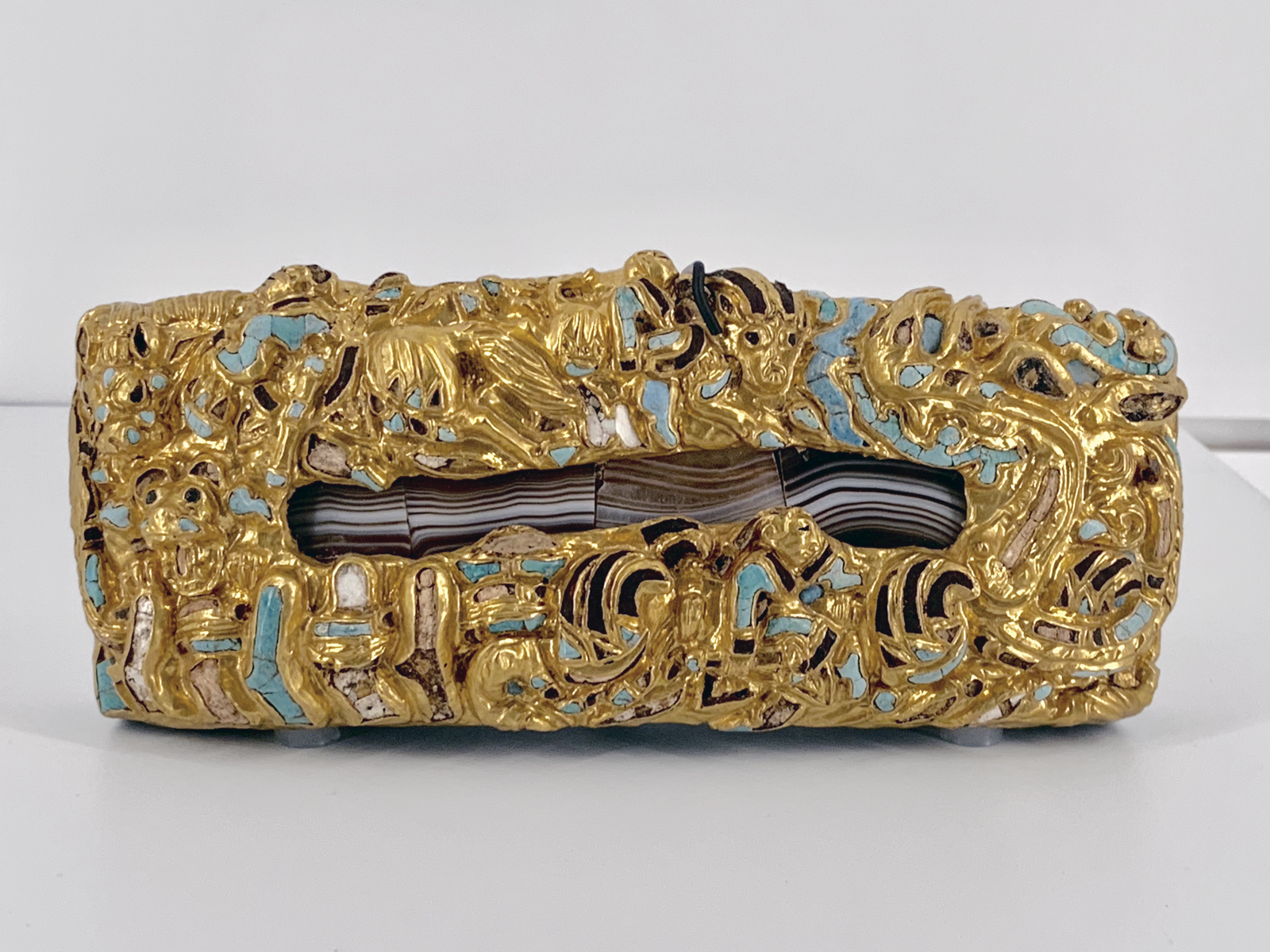 Silver, copper, gold, patinated copper-gold alloy, patinated copper-platinum-iron alloy, and niello