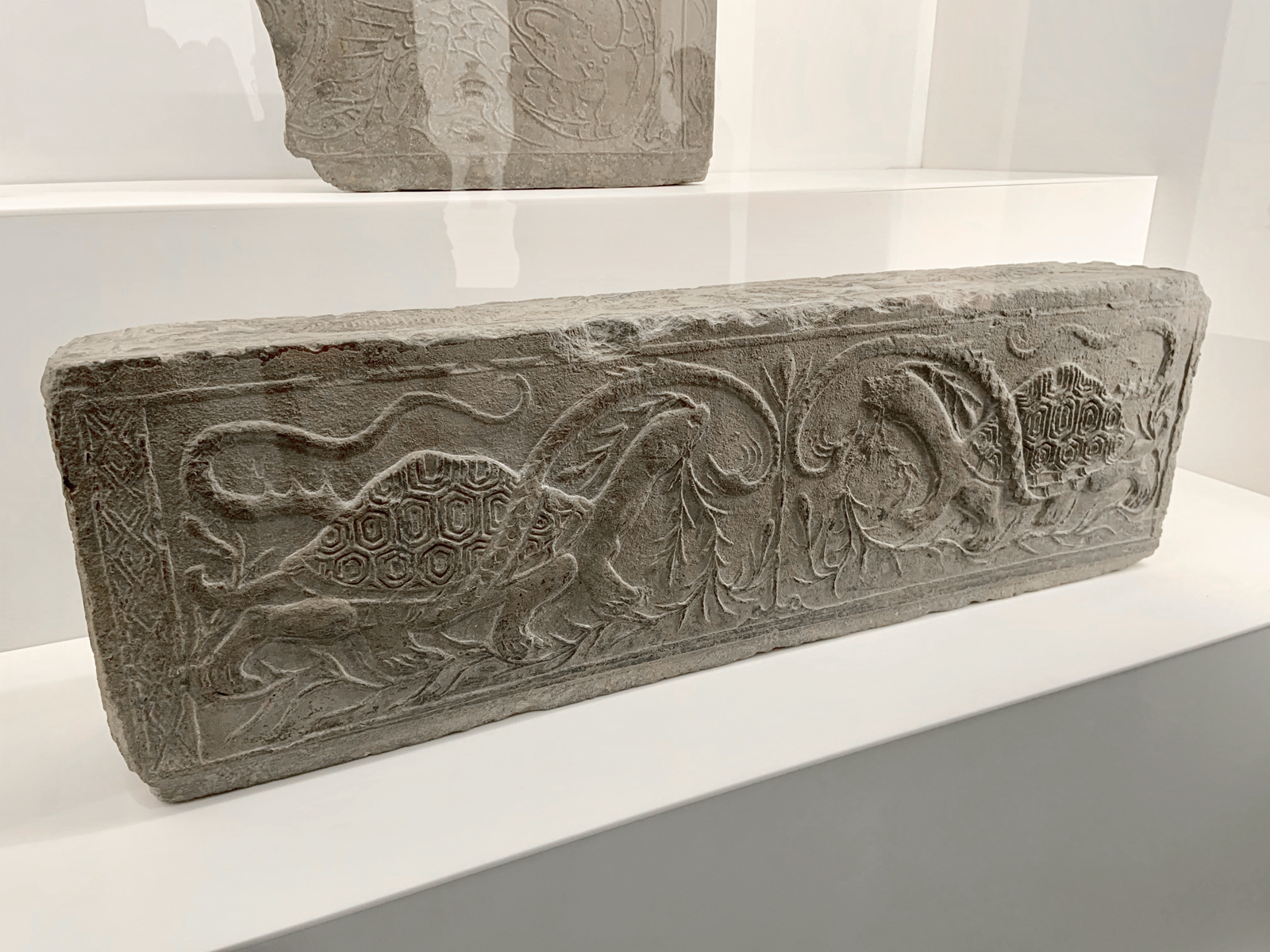 Moore assembled an extensive library, which includes a rare, lavish fourteen-volume publication on the Basilica of San Marco in Venice. Produced between 1881 and 1888 under the direction of Italian restoration architect and art historian Camillo Boito, it documents in text and chromolithograph illustrations virtually every detail of the centuries-old basilica. The volume on view here is devoted to the mosaic floors. The image replicates multicoloured geometric patterns from borders that frame some of the floors’ rectangular fields. Their variety and rhythmic energy would have resonated with Moore’s aesthetic sensibilities. Figure IX, in the lower right, bears striking similarities to the Tiffany cup and saucer displayed nearby.