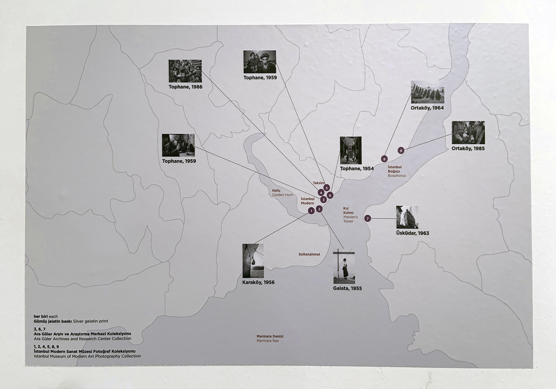 The exhibition brings together photographs from different periods that were signed by him, as well as various dark room prints, objects and ephemera from the archives of the Istanbul Modern Photography Collection and the Ara Güler Museum, and maps that situate the works in different neighbourhoods and angles. As a whole, the exhibition aims to address the relationship between photography and a photographer’s subjectivity through the works of Güler, who defines himself as a photojournalist and photojournalists as “people who write history with their cameras.”