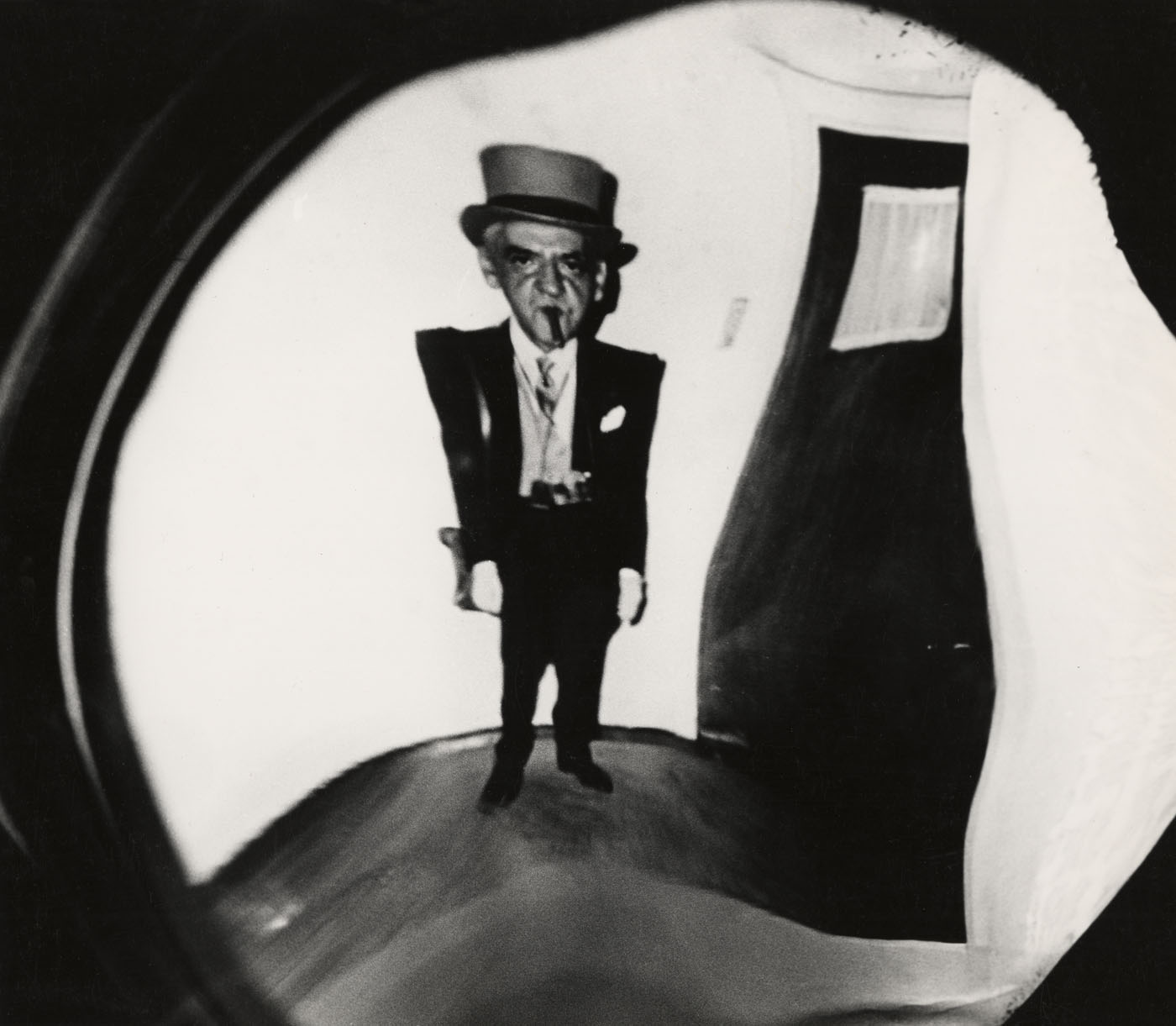 Installation view of the exhibition Weegee. Autopsy of the Spectacle at Fundación MAPFRE, Madrid showing at right Weegee’s Self-portrait, Distortion (1955, below)