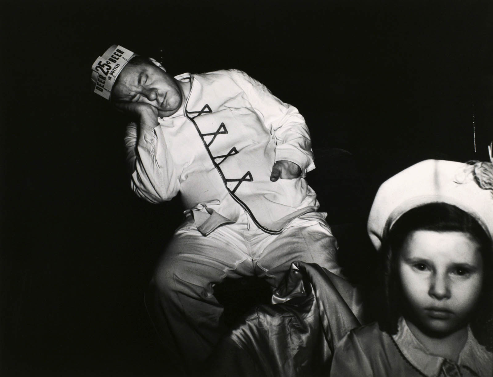 Harry Lapow began frequenting Coney Island to capture quirks of the beach and boardwalk after receiving a Ciroflex camera on his forty-third birthday. He was intrigued by the camera’s ability to isolate details and fleeting moments of everyday life. Here, a toddler’s crossed legs appear above the head of a buried woman whose eyes are covered by a floral towel. In cropping this beach sighting, Lapow crafts a surprising juxtaposition, forming an unlikely dynamic between the lively child and the masked adult.