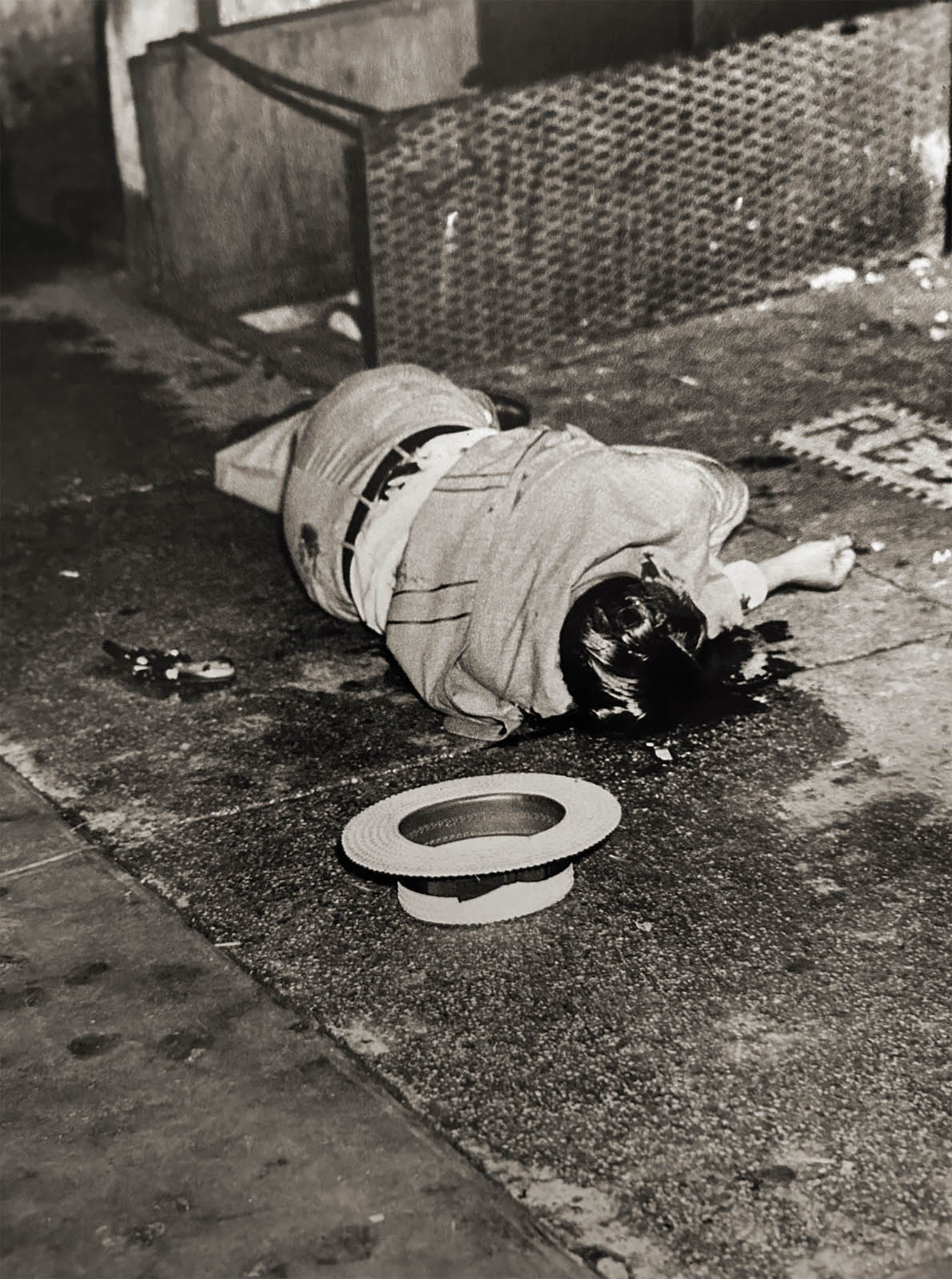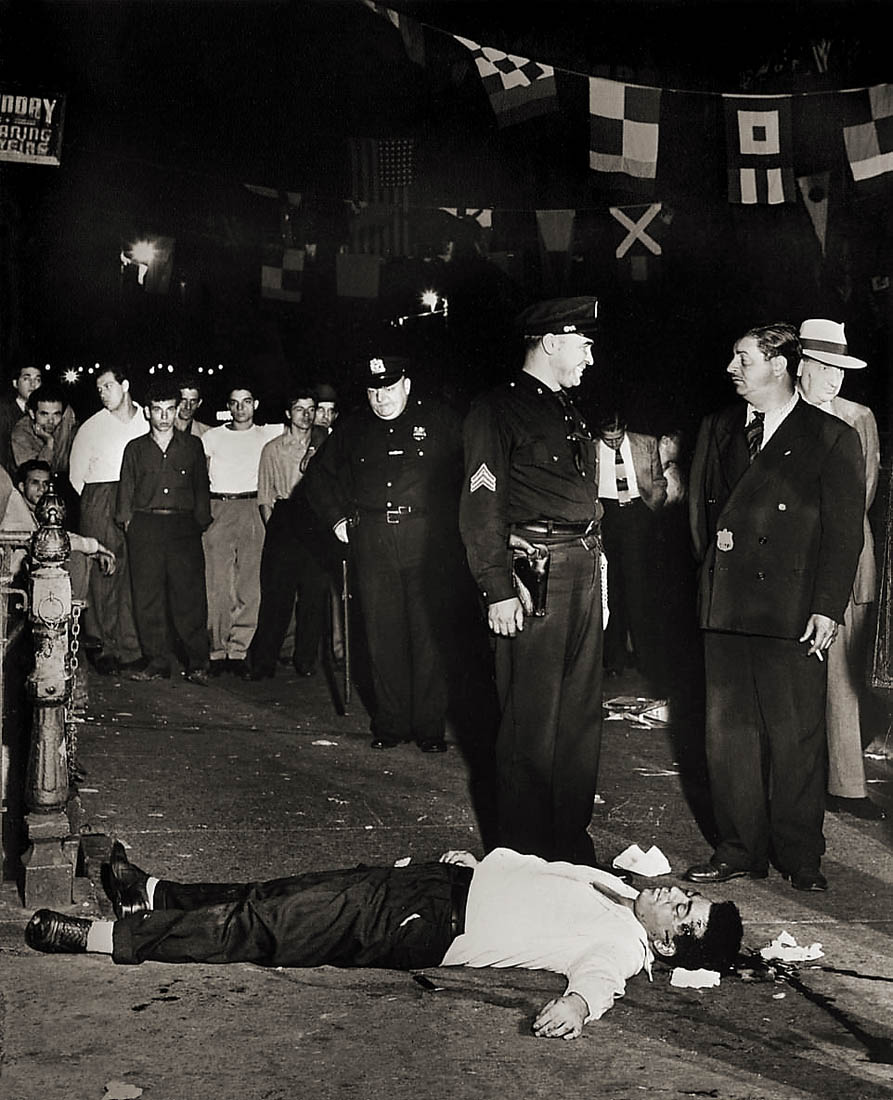 In other photographs such as Body of Andrew Izzo, killed by off-duty policeman Elegio Sarro (1942, below) and Body of Dominic Didato (1936, below) Weegee’s camera becomes the spectator, standing in for us as we crane our necks to get a better view of the action. Together, the camera and the viewer, perform what could be seen as a form of “necropsy” – from the Greek words nekros (meaning “corpse”) and opsis (meaning “to view”), and together they mean “to look at the dead body with naked eyes” – that is, a macroscopic examination of a dead body.