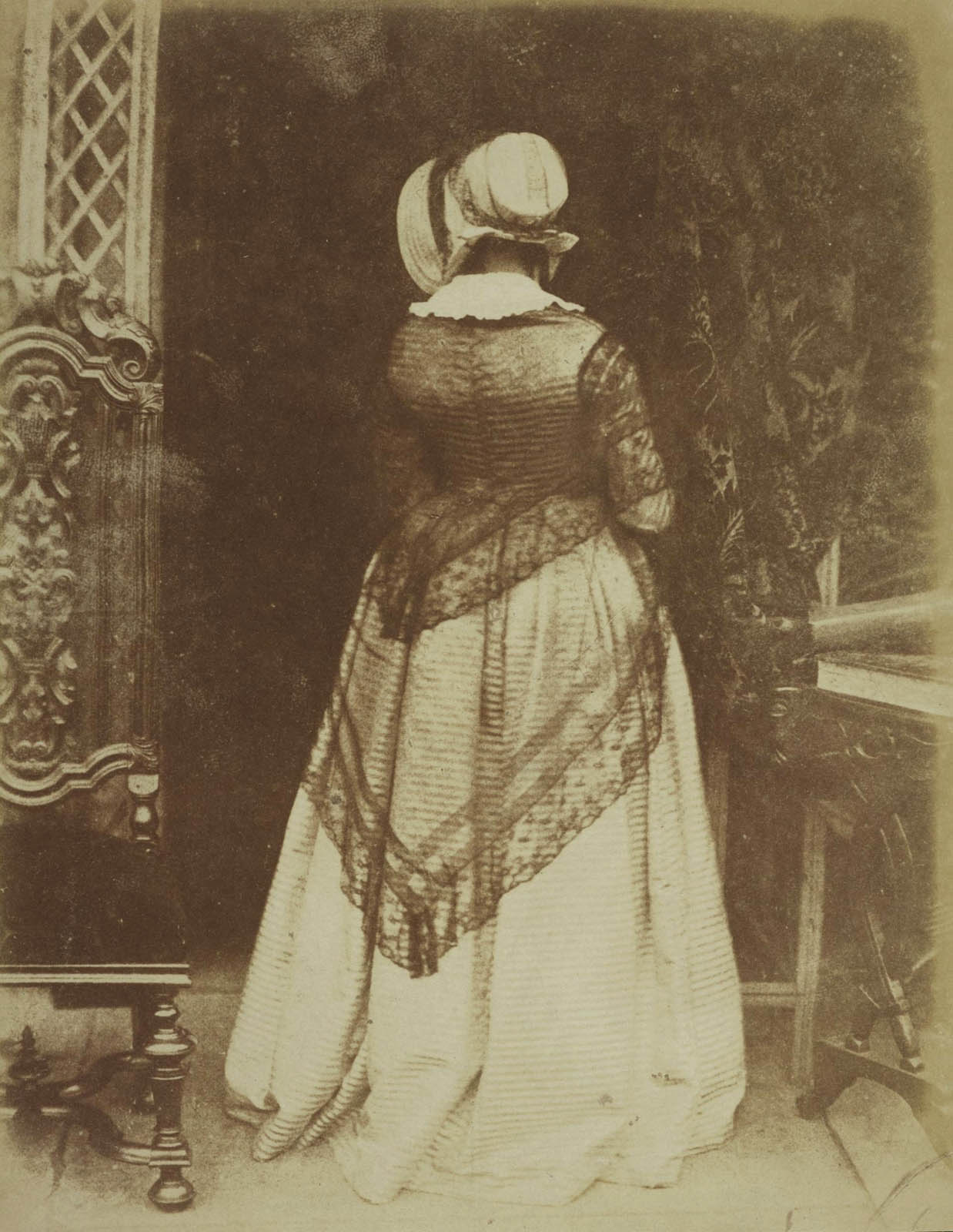 The subject of this photograph is Lady Ruthven but the focus is on her clothing. The pose, with her body angled diagonally away from the camera, allowed Hill and Adamson to capture how light fell on the different textures in her outfit. In both the negative and the final print, the intricate lace of her shawl is almost translucent draped over the delicate pattern of the dress below. This is one of the most technically accomplished photographs made by Hill and Adamson during their partnership.