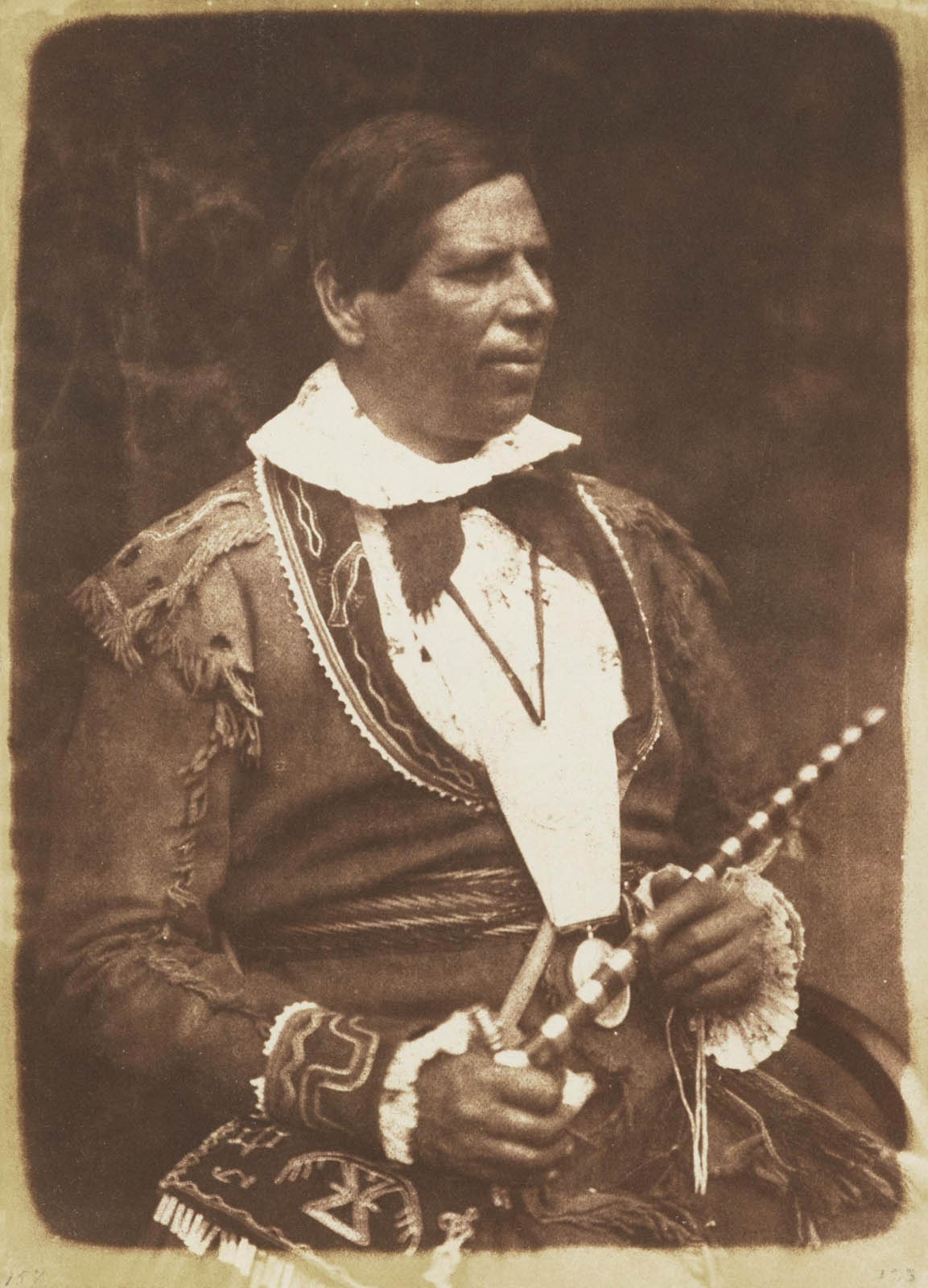Born in Canada, Peter Jones’ father was a Welsh-born, American immigrant and his mother was of Ojibwa Indian ancestry. He grew up as a Native-American Indian with the name ‘Kahkewāquonāby’, meaning sacred waving feathers. Following his father’s wishes he was baptised by the Methodist church which led to his role as an Indian missionary. To fundraise he toured the United States and the United Kingdom, giving speeches and sermons to captivated audiences. He arrived in Edinburgh in July 1845 and this calotype is one of a series showing Jones in both Indian attire and western clothes. These are some of the oldest surviving photographs of a North American Indian.
