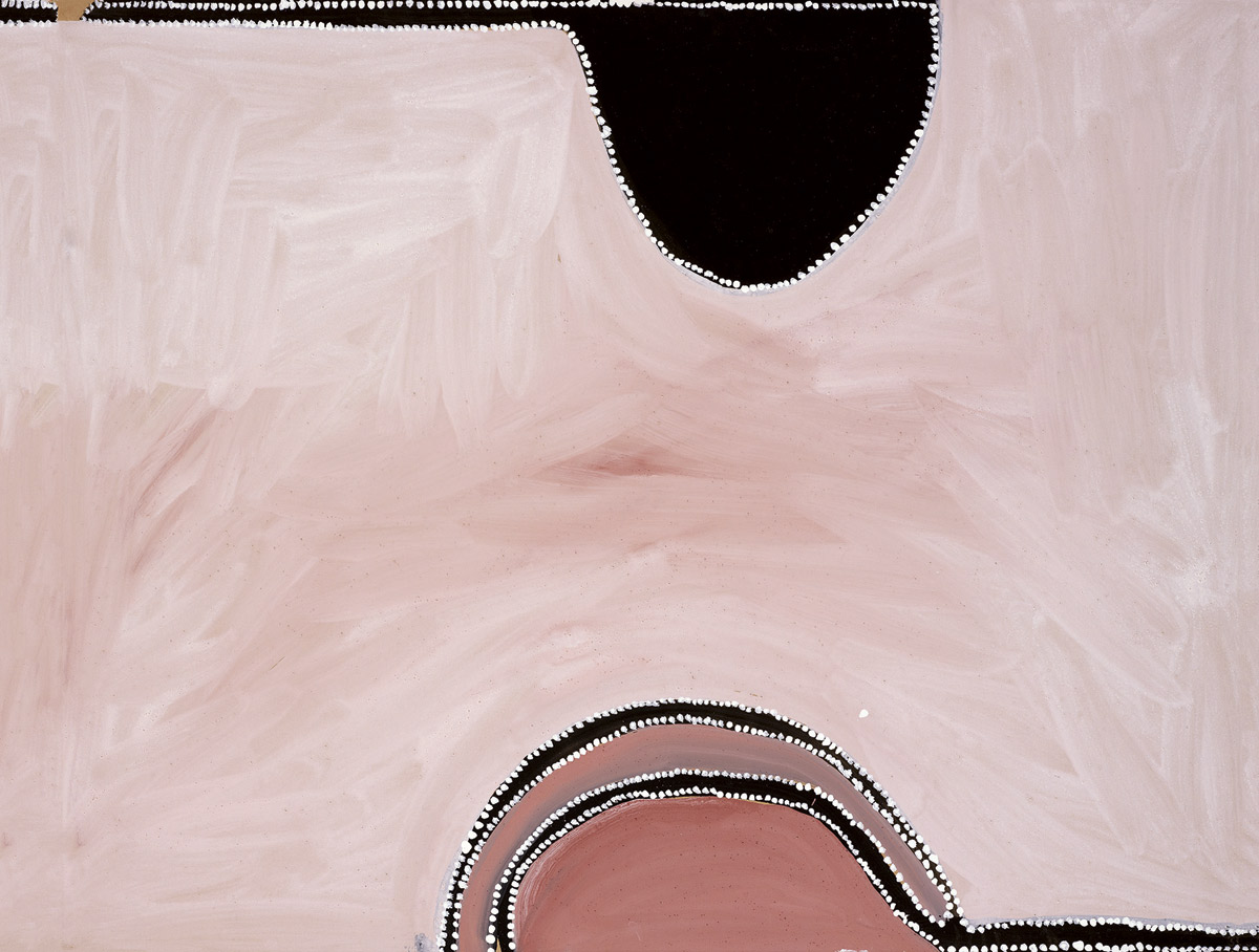 Merrmerrji-Queensland Creek, 2005 is characteristically sparse in composition with bold forms, a rhythmic application of dotted fluid lines and a powerfully imposing colour palate, which is gained from a wet-on-wet mixture of white and ochre pigments suspended in a fast drying acrylic medium. The effect is a pearly radiant luminosity, an ambience of the sacred.”