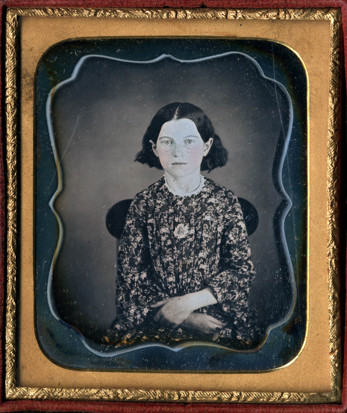 Unknown photographer (American) Freckled girl with daguerreotype c. 1850 Daguerreotype retouched in colour