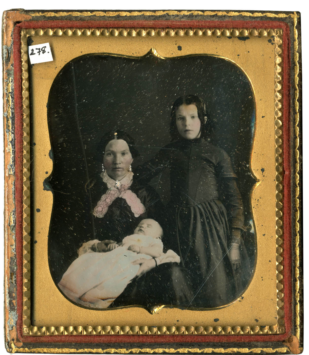 Unknown photographer (American) A mother, daughter and dead infant c. 1848 Daguerreotype retouched in colour Title given by the collector